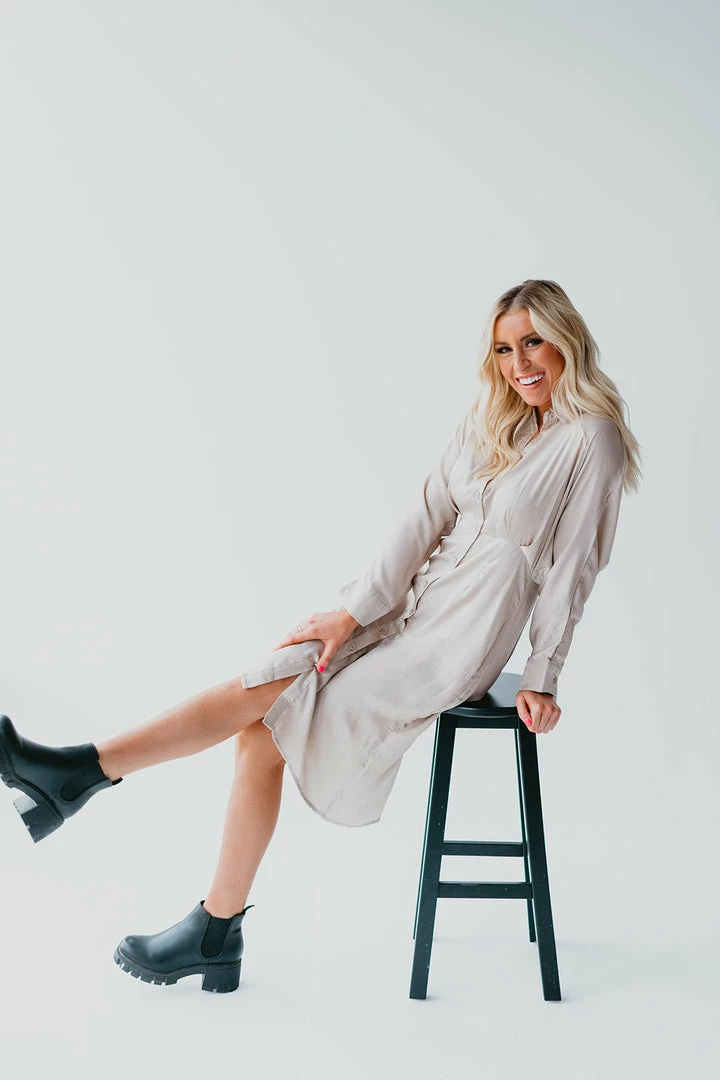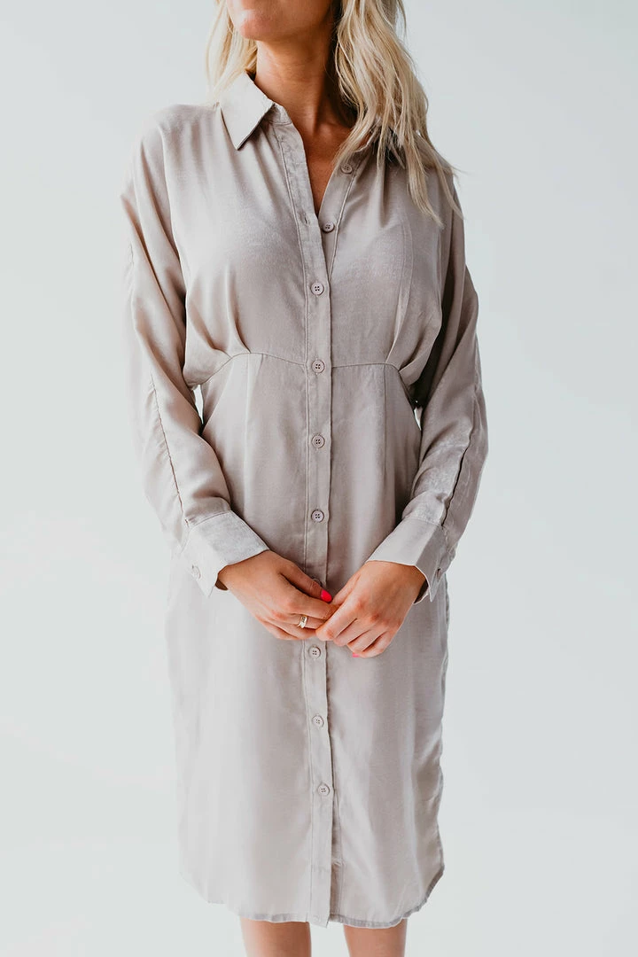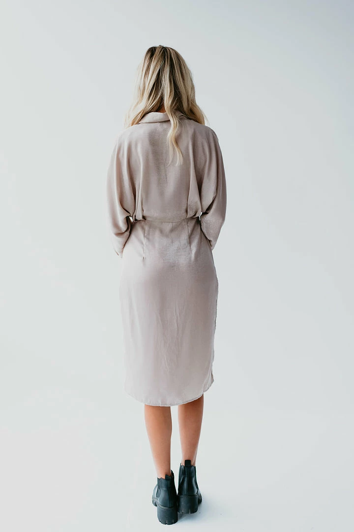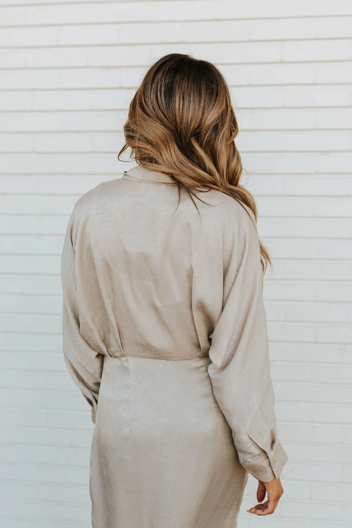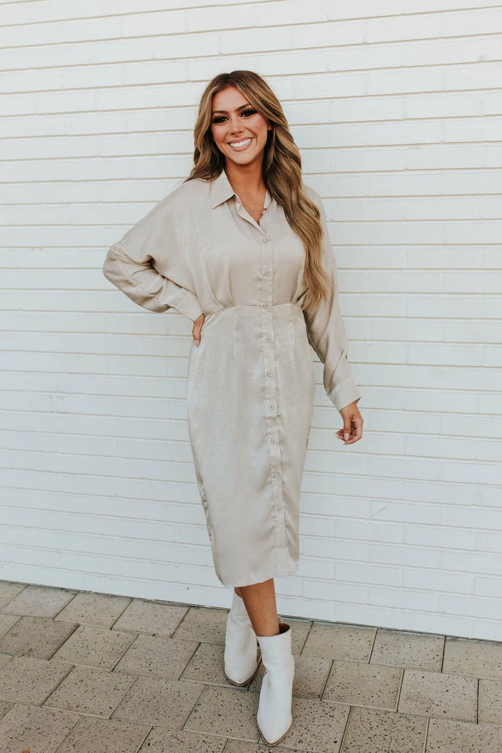 This pretty midi dress is going to be a must have in your closet this holiday season! The gorgeous, subtle champagne color is perfect to pair with statement shoes! Wear under any sort of coat or jacket for your favorite cool weather outings!