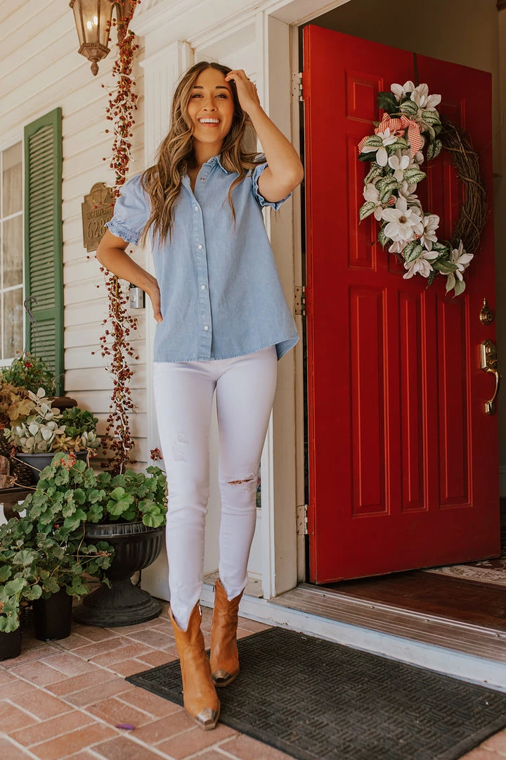 Paired with The Vervet High Rise Distressed Skinny Jeans in Optic White.