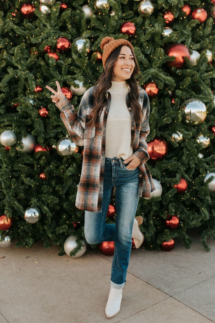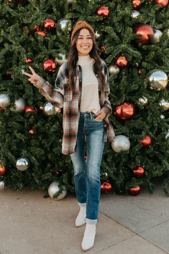 Paired with The Montana Mock Neck Sweater in Cream and The Naomi Flannel Shacket in Navy