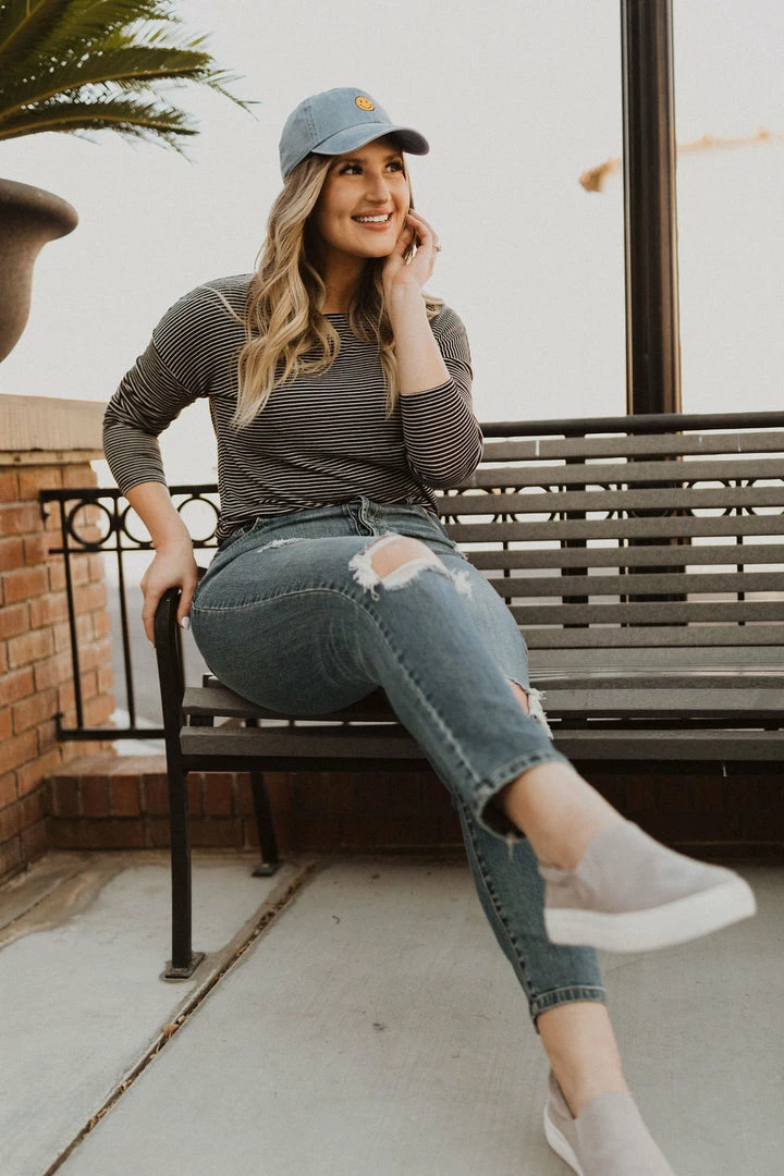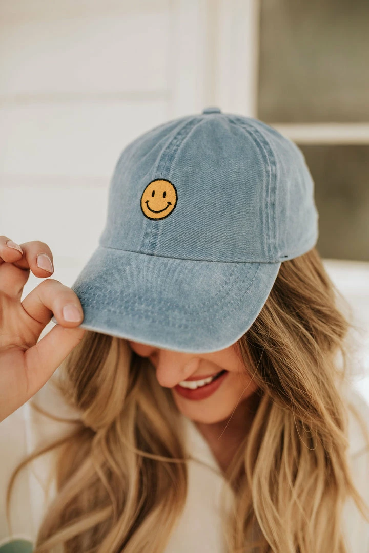 Bring back those 90’s vibes with this adorable vintage washed denim hat. The embroidered smiley face graphic on the front will brighten up any day!