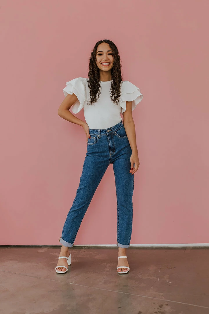 Paired with The Staci Mom Jeans in Vintage Blue and The Rachel Strappy Heels in Off White.
