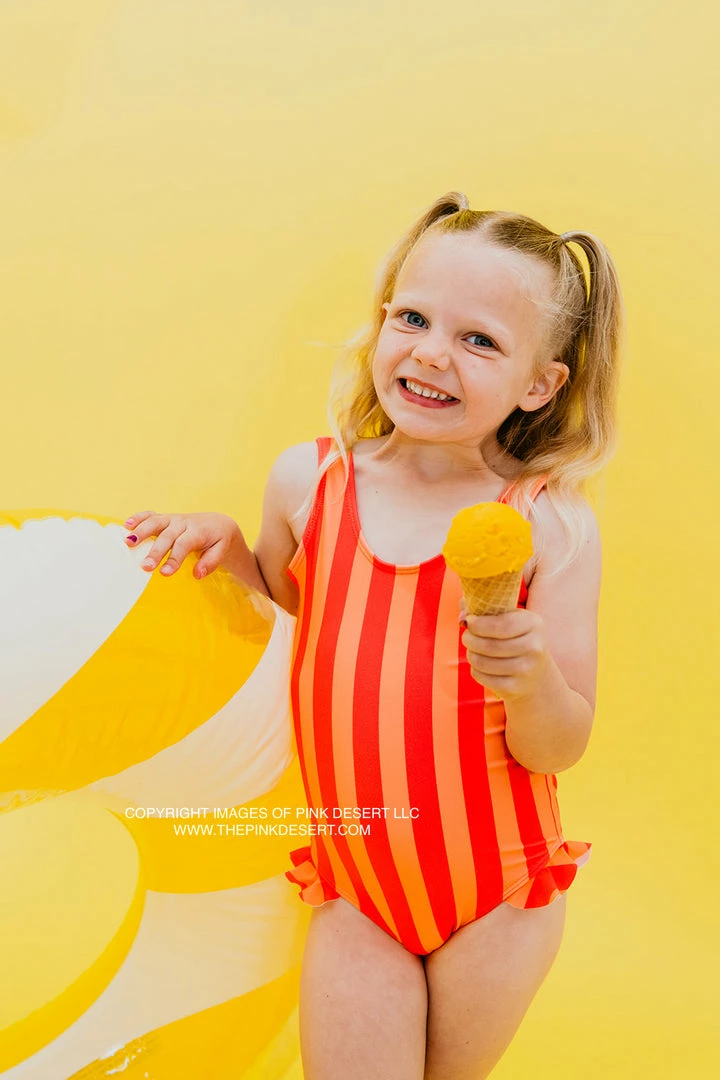 Match your little one in one of our exclusive Pink Desert Sorbet Stripe suits! This suit features a ruffle detail at the leg to add that little bit of girly flair!