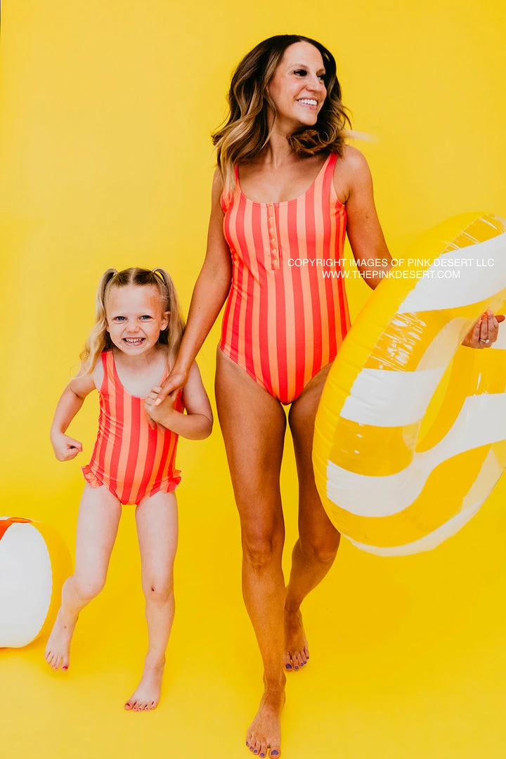 Mix and match with the mommy suits in Sorbet Stripe: Button Front One Piece, High Waist Swim Bottoms, Button Front Midkini, High Waist Tie Front Swim Bottoms