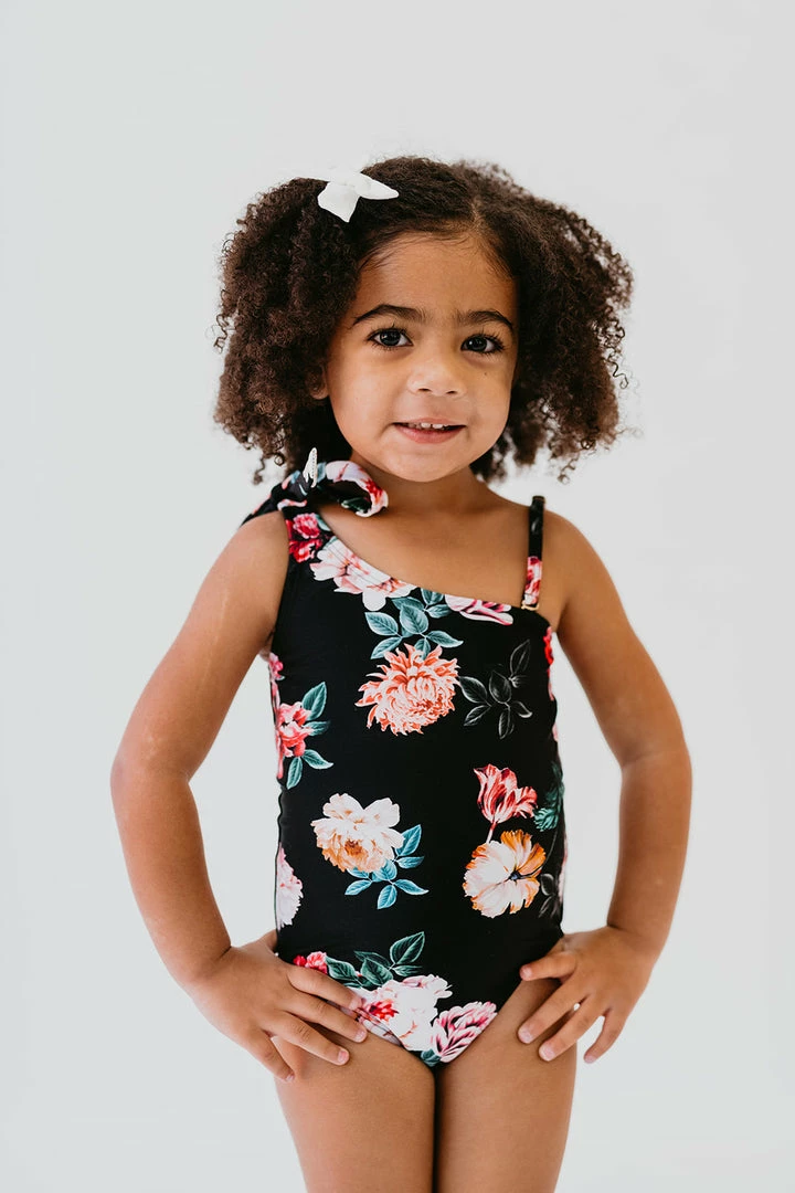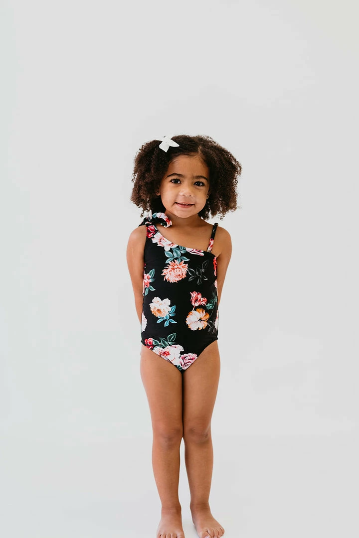 Our newest design for little girls swim to match mama, the One Shoulder Bow One piece! Match your little one in one of our exclusive Le Fleur floral suits! This suit features an adjustable tie strap on the right shoulder, with a removable, adjustable spaghetti strap on the left for some girly charm!