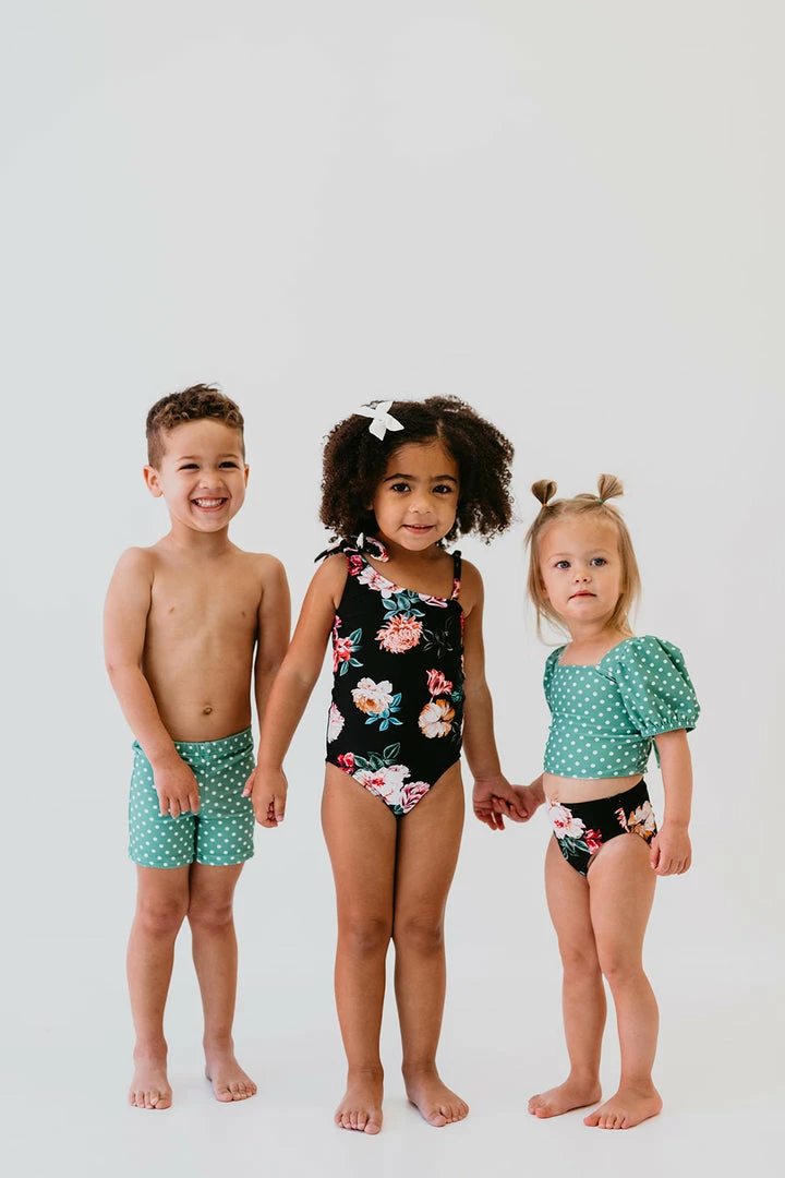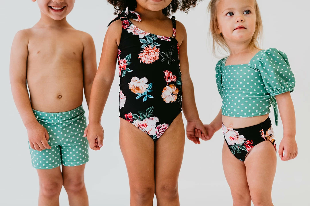 Mix and match with the mommy suits in Le Fleur: Puff Sleeve Midkini Swim Top, Elevated Peplum Tankini Swim Top, Puff Sleeve One Piece, One Shoulder Bow One Piece, High Waisted Swim Skirt, High Waisted Tie Front Swim Bottoms, and High Waist Swim Bottoms.