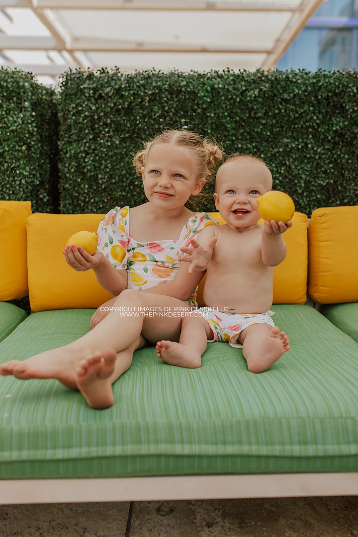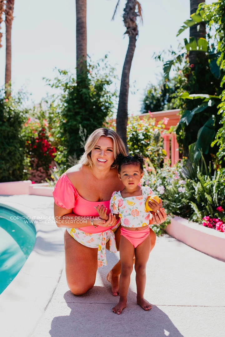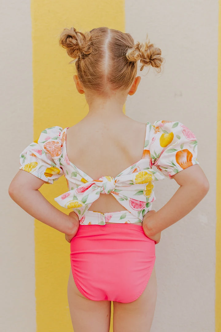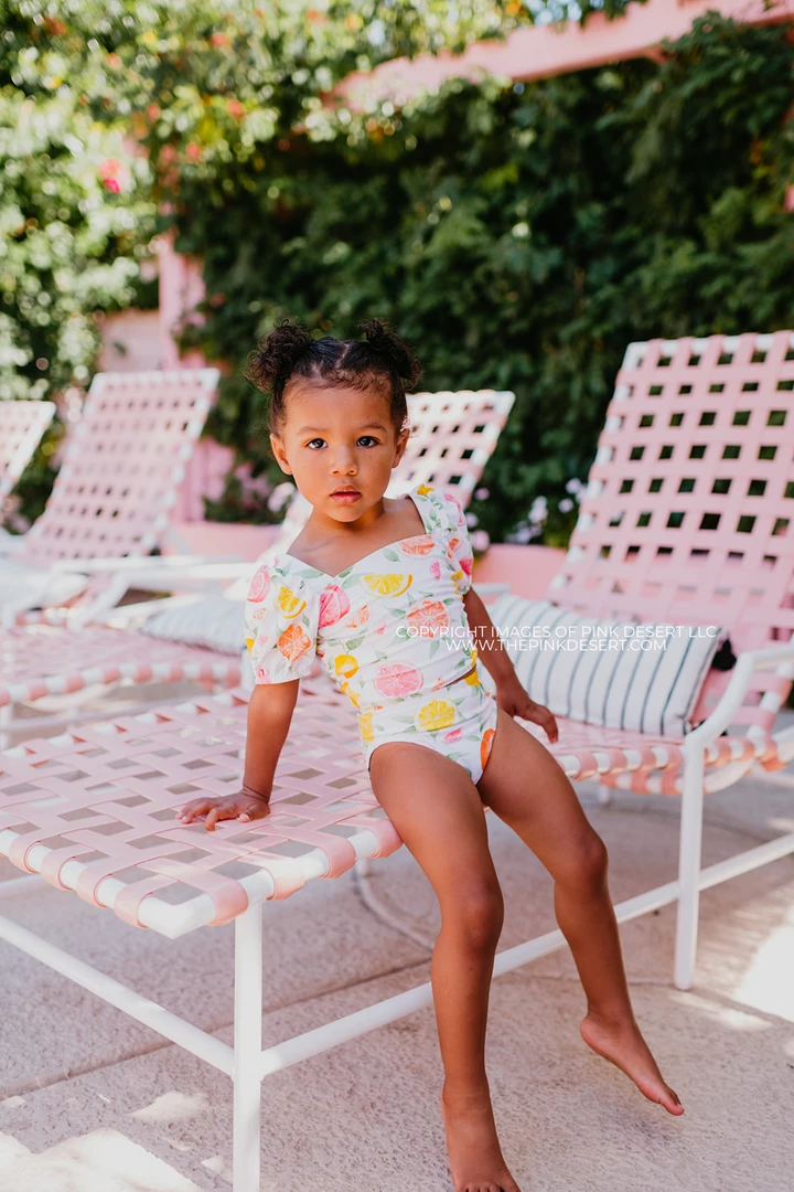 Our BRAND NEW signature swim top in Citrus Print by Sassy Red Lipstick x Pink Desert for little girls is a mini version of mama’s with the matching fun puff sleeves! Match your little one in one of our exclusive Citrus Print suits! This top features adjustable tie sashes across the shoulder blade, with adjustable straps across the back of the ribs for room to grow!