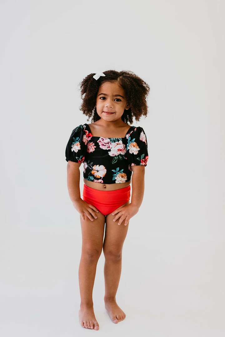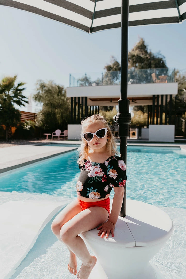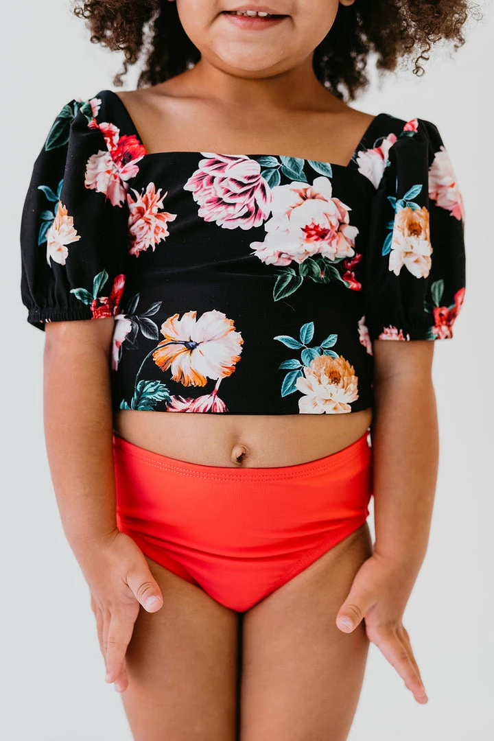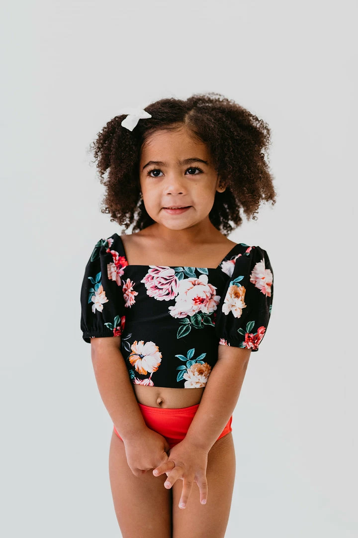 Our BRAND NEW signature floral swim top for little girls is a mini version of mama’s with the matching fun puff sleeves! Match your little one in one of our exclusive Le Fleur floral suits! This top features adjustable tie sashes across the shoulder blade, with adjustable straps across the back of the ribs for room to grow!