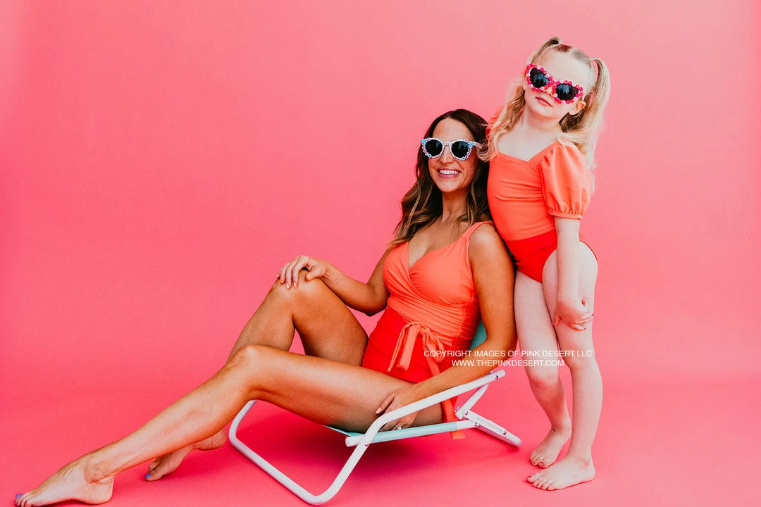 Mix and match with the mommy suits in Ribbed Peachberry: Puff Sleeve Midkini Swim Top and Puff Sleeve One Piece.