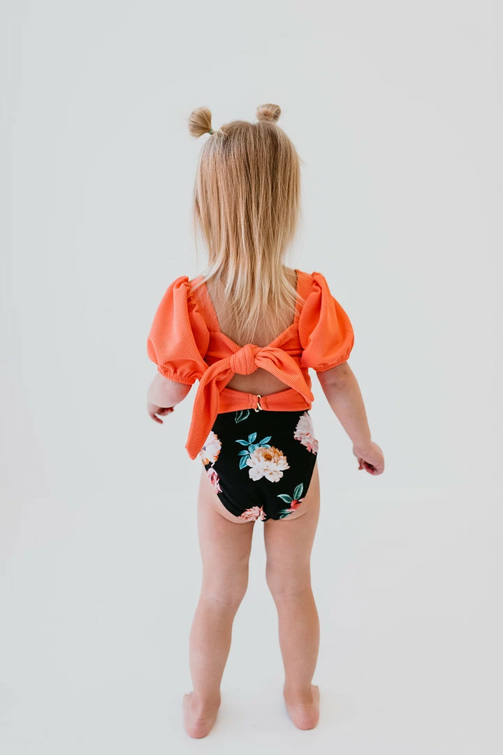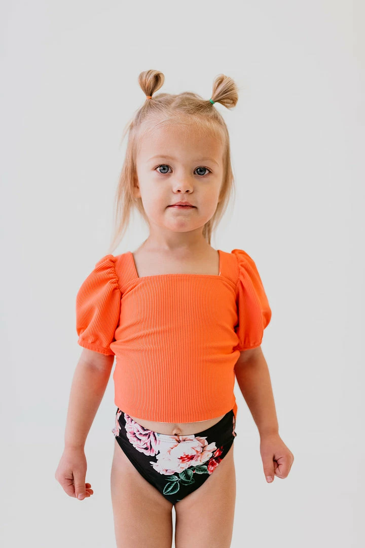 Our BRAND NEW signature swim top for little girls is a mini version of mama’s with the matching fun puff sleeves! Match your little one in one of our exclusive ribbed Peachberry suits! This top features adjustable tie sashes across the shoulder blade, with adjustable straps across the back of the ribs for room to grow!