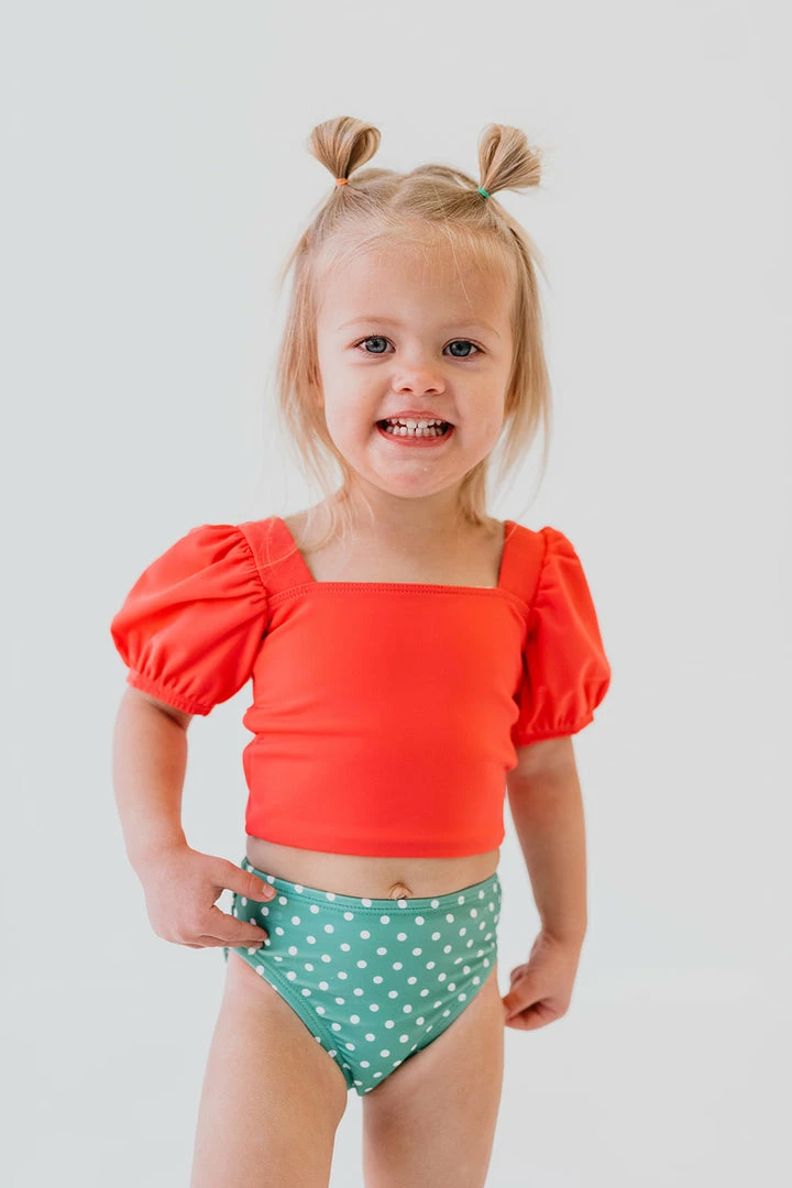 A matching mini version of mama’s green polka dot high waist swim bottom for your little girl! Our little girls bottoms to pair with their Puff Sleeve Swim Top. Match your little one in one of our exclusive Ciao! Polka Dot suits!