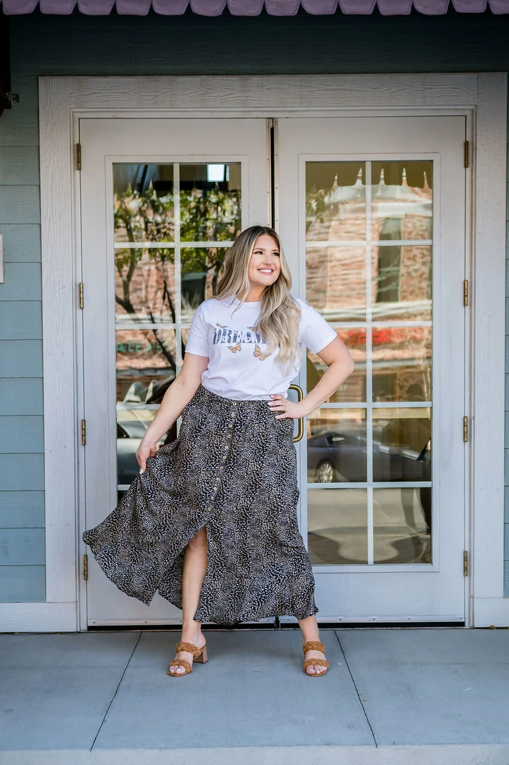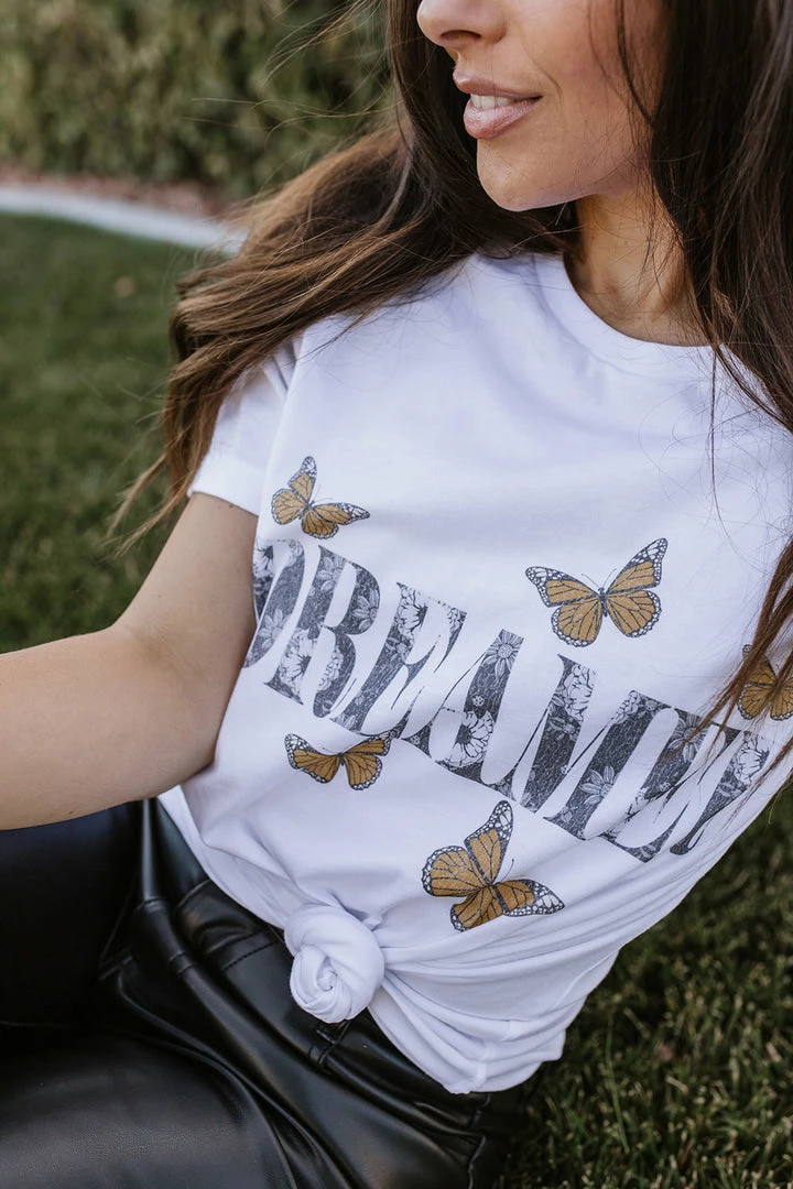 Be a dreamer in this adorable graphic tee! Pairs great with any bottom, whether it’s denim, leggings, a skirt or biker shorts you will be feeling as light as a butterfly!