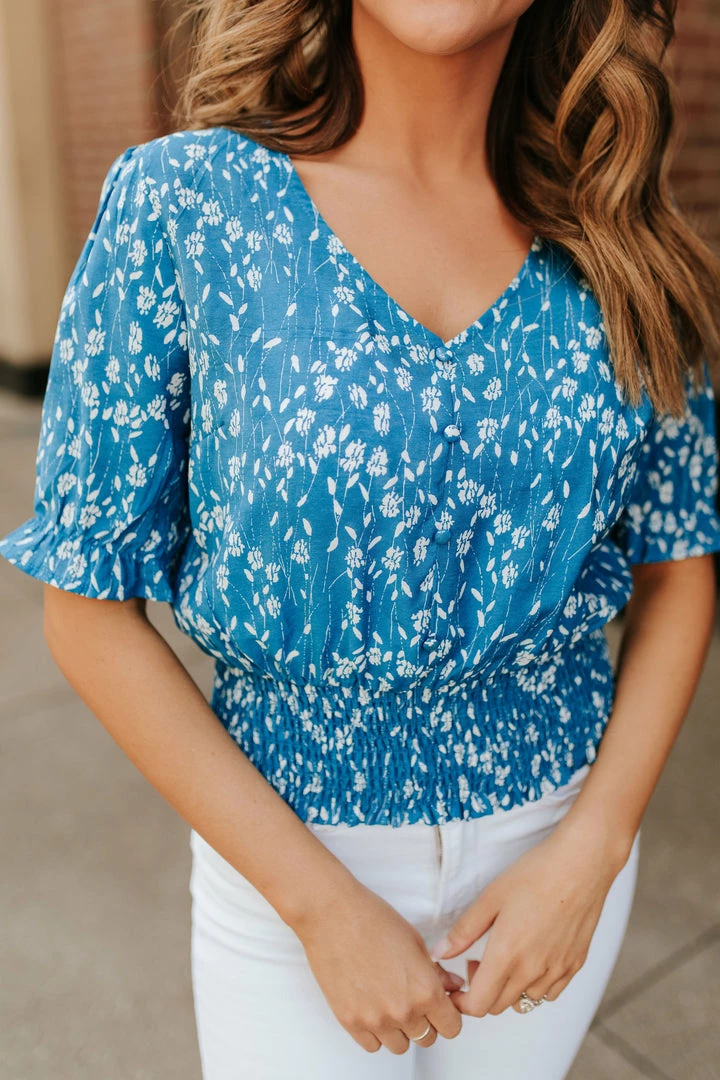 Summer is coming, and we are in love with this fun blue and white floral print for every day! With it’s lightweight fabric, you will find yourself reaching for this top CONSTANTLY! For date night, pair with a skirt and heels, or pair it with jean shorts and sandals for a barbecue!