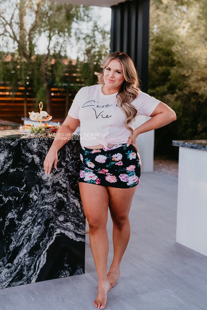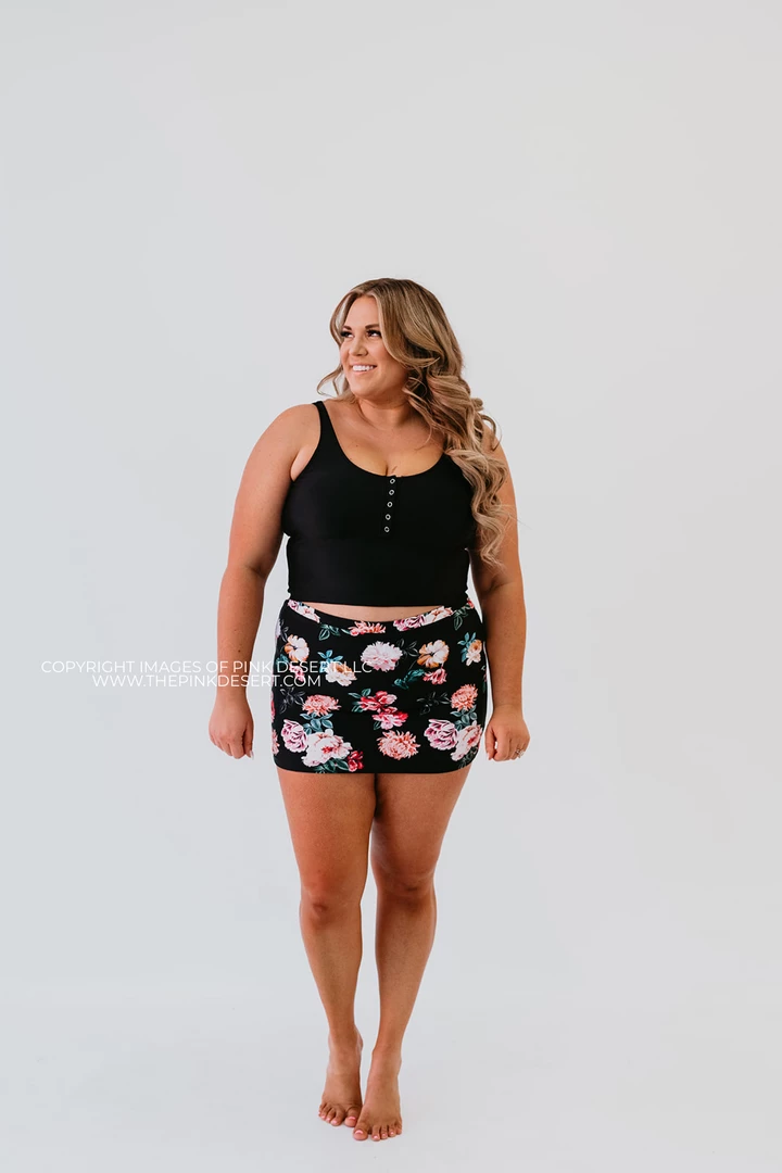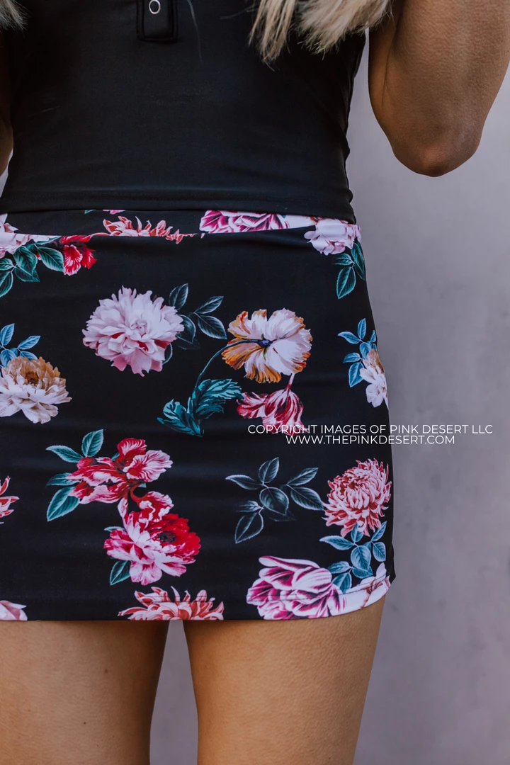 Looking for stylish full coverage bottoms?! Sit poolside in this black floral printed swim skirt that comes with built-in swim shorts. Adds that extra length you’ve been looking for!