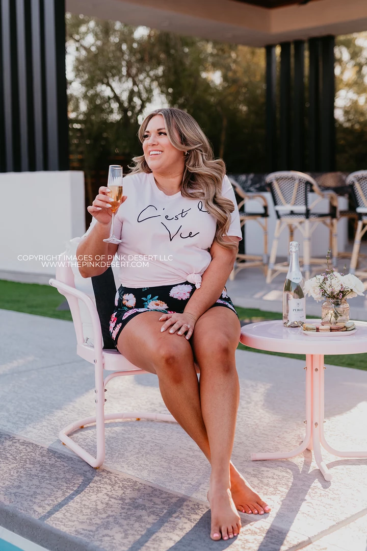 Paired with our Button Front Midkini Swim Top in Ribbed Peachberry, Button Front Midkini Swim Top in Solid Black, C’est La Vie Tee in Baby Pink, and Puff Sleeve Midkini in Ribbed Peachberry