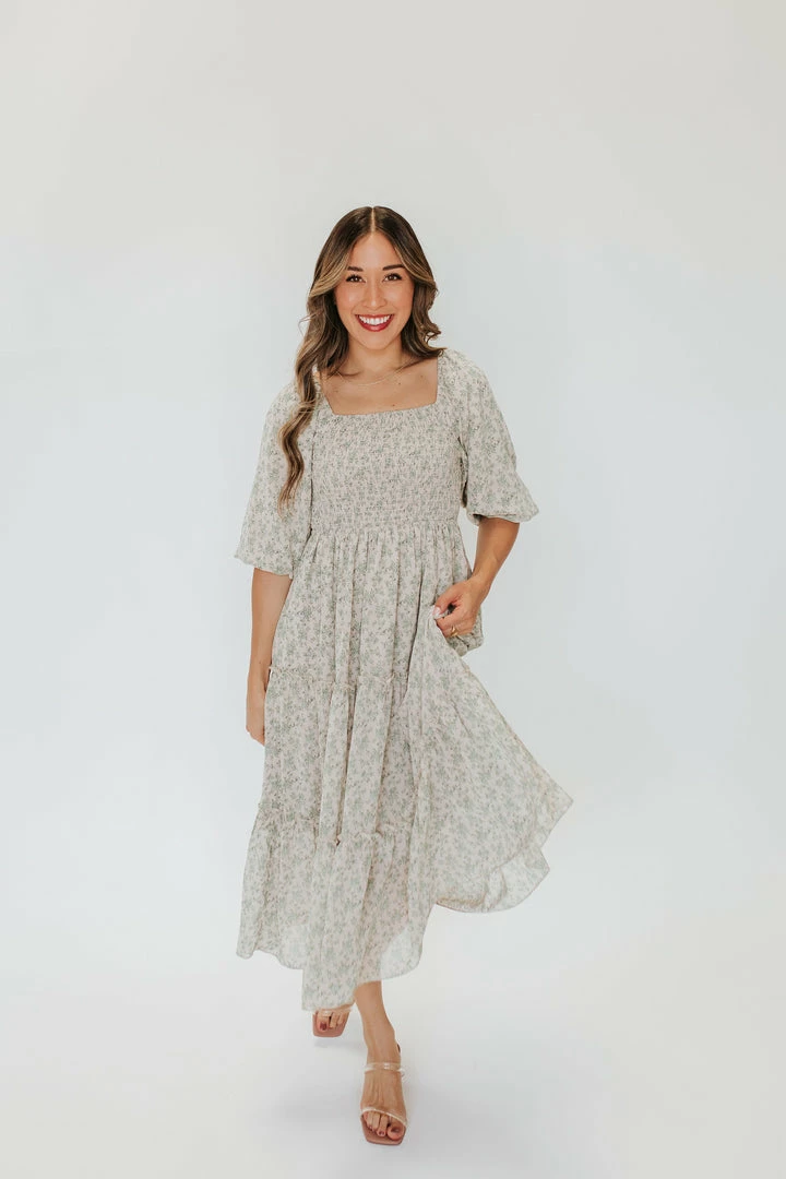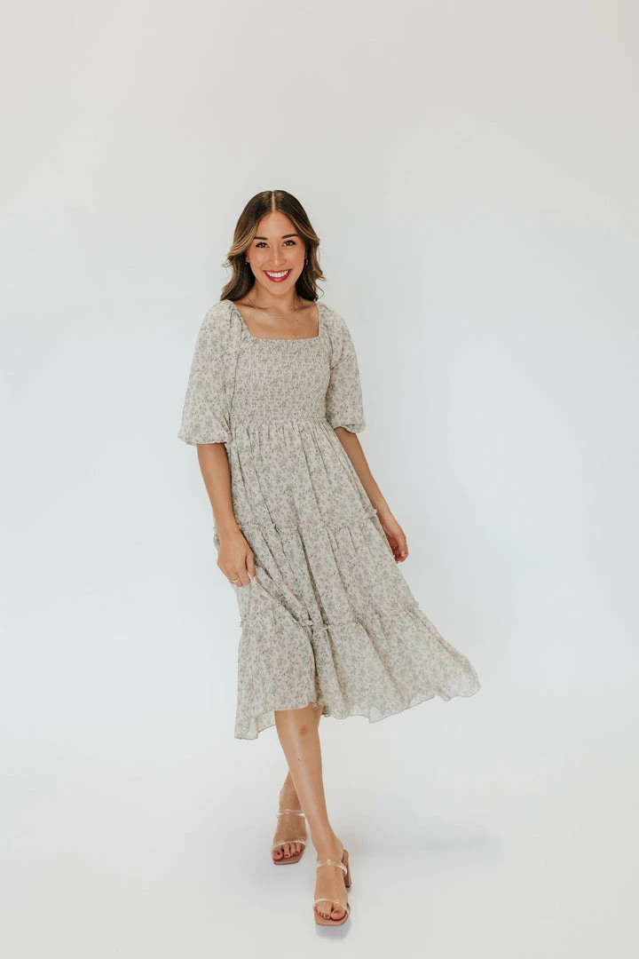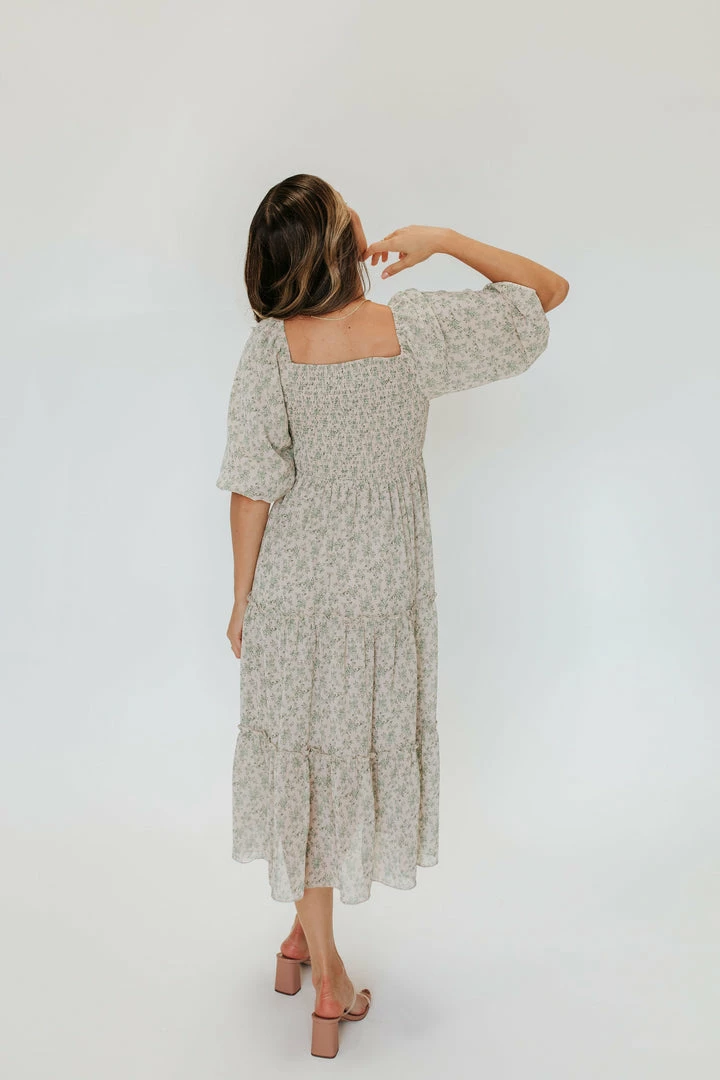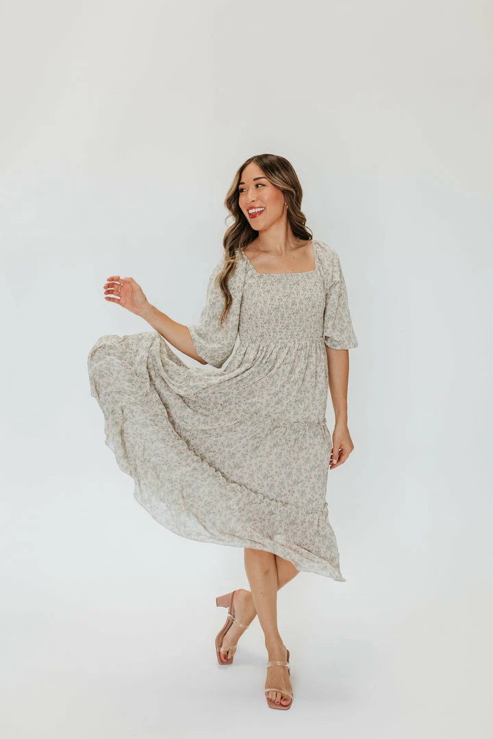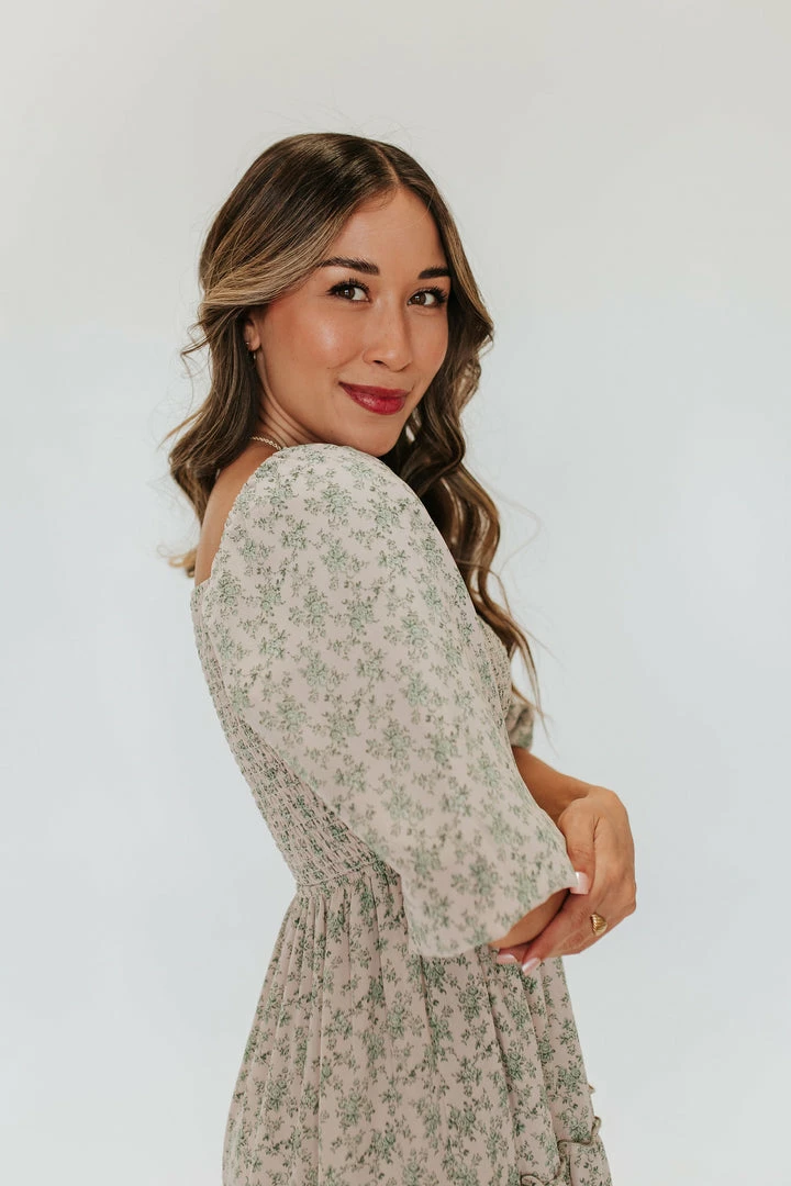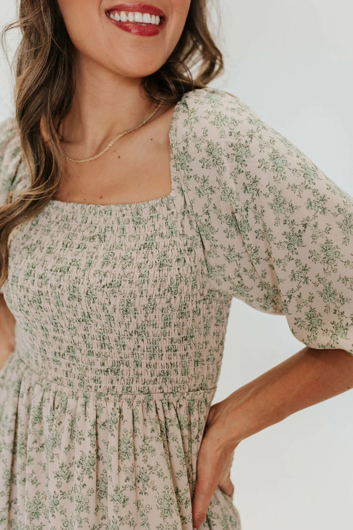 Mikarose brand. This dress is so cute and classic! The fit is perfectly flattering! We love the cute floral print throughout and the three quarter sleeves add a little flair! Pair this dress with your favorite sandals for the perfect summer look!