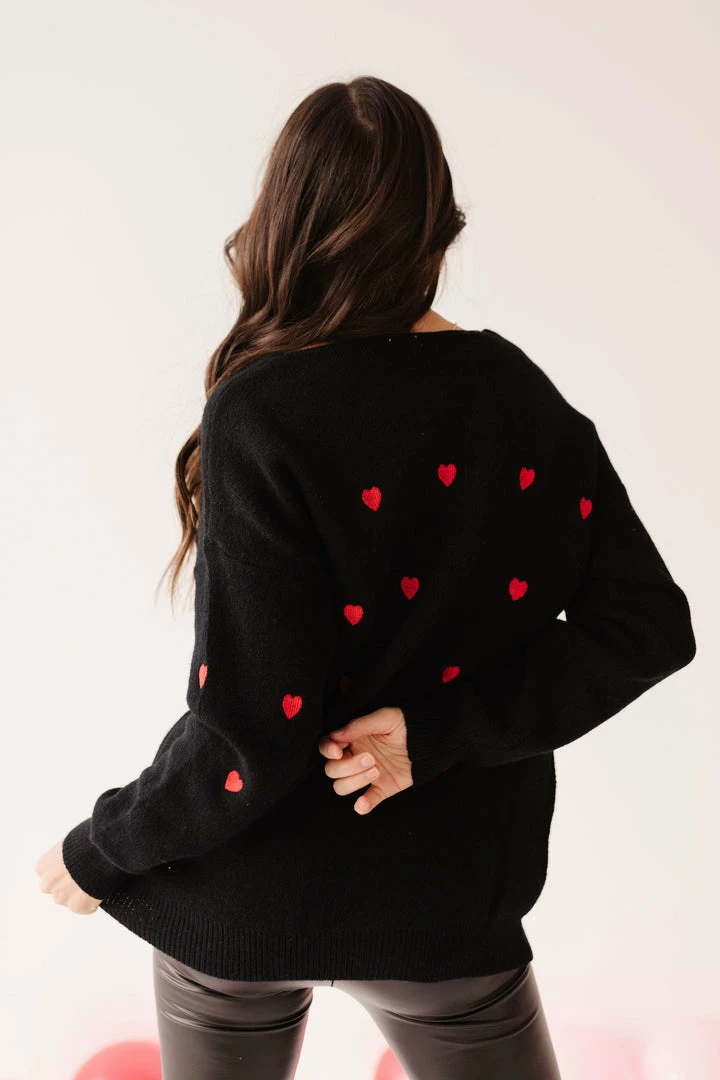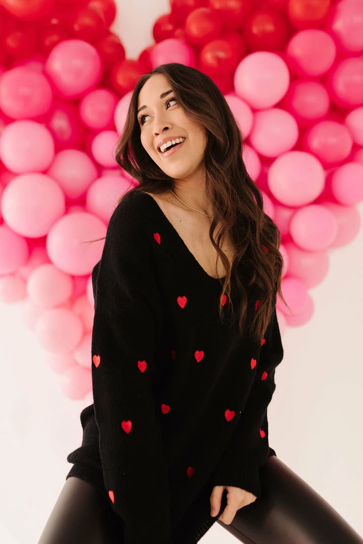 Whether your heart is attached or seeking it’s other half, this sweater has the potential to conquer all! The embroidered hearts and comfy knit are perfect for a Valentines in, or on the town!