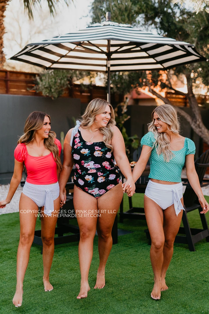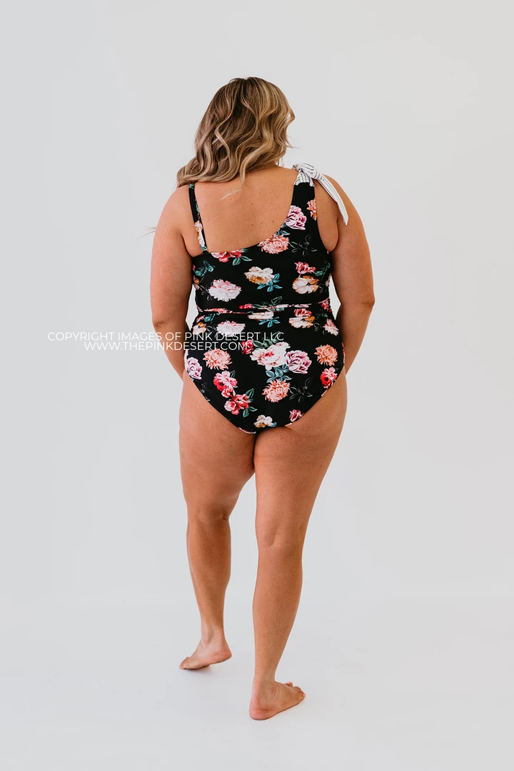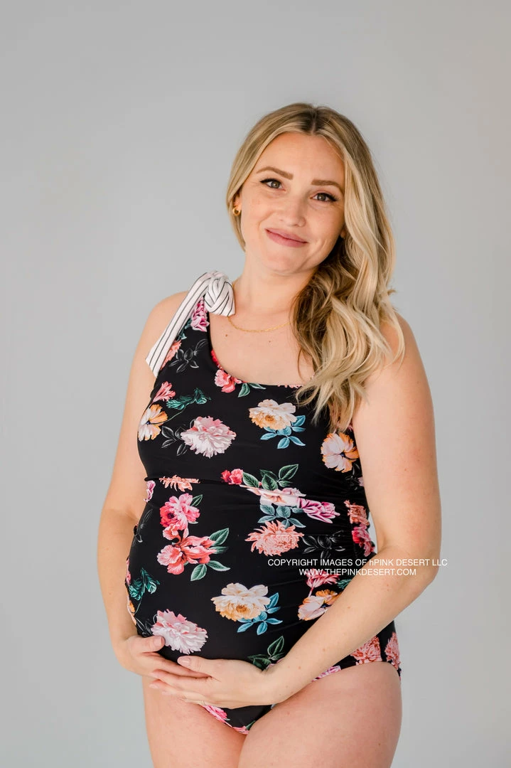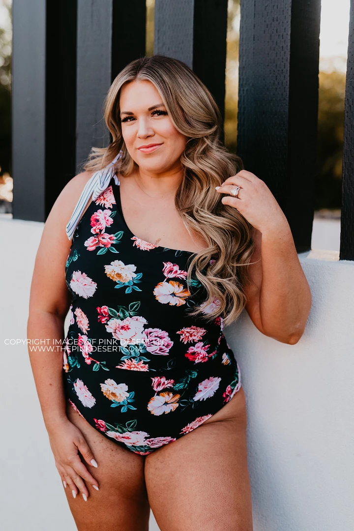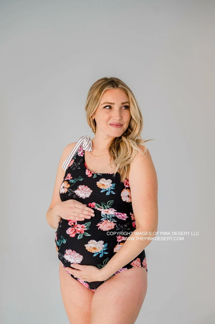 Our brand new one shoulder bow one piece in floral print was made to be flattering, flirty, modest, maternity friendly and features full coverage and side ruching. Designed with a classic French inspired floral print on black and contrasting black and white stripe print on a whimsical tie at the shoulder! Swimsuit features flattering side-ruching on the waist for a slimming look on all shapes. Adjustable tie strap on your right shoulder, with a removable, adjustable spaghetti strap on your left to get the best fit for your bust and shoulders while being nursing friendly.