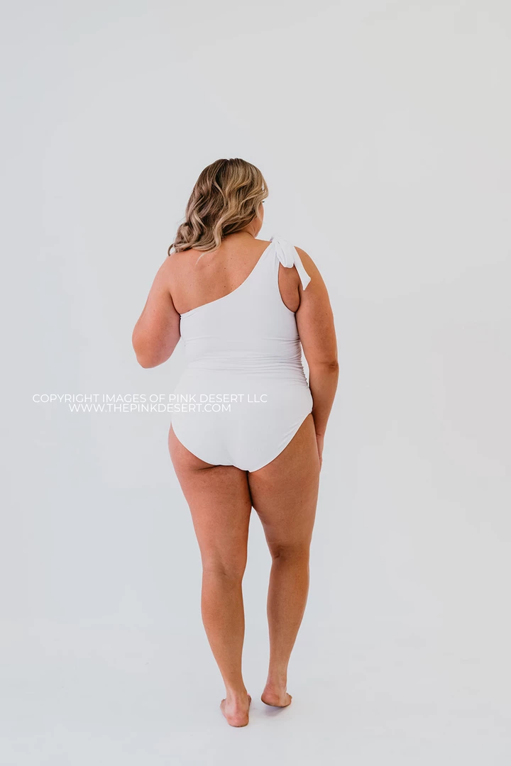 It just gets better! Your new favorite one-piece has all the details. Featuring a functioning one shoulder bow tie in a fully lined ribbed white fabric. This is a flattering one-piece swimsuit with side-ruching on the waist for a slimming look on all shapes! Side-ruching detail allows for extra stretch and is a great maternity friendly swimsuit option. Complete with a removable, adjustable spaghetti strap on your left to get the best fit for your bust and shoulders while offering a nursing friendly swimsuit feature.