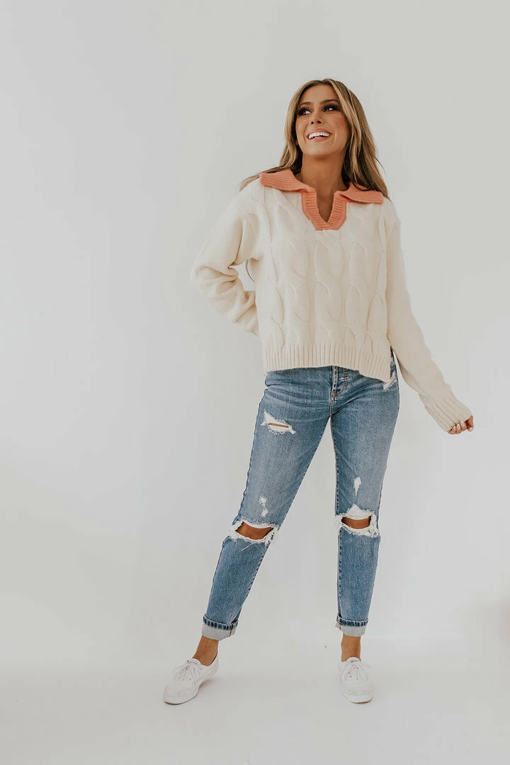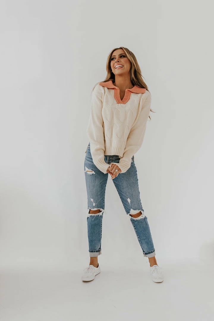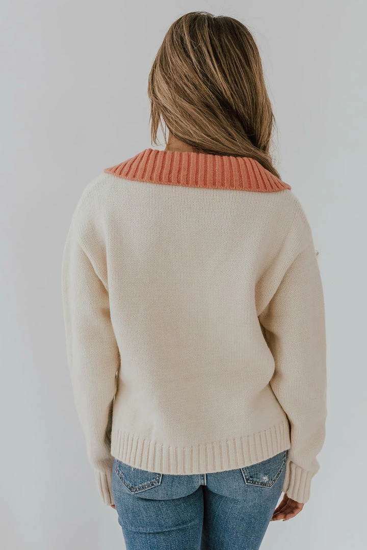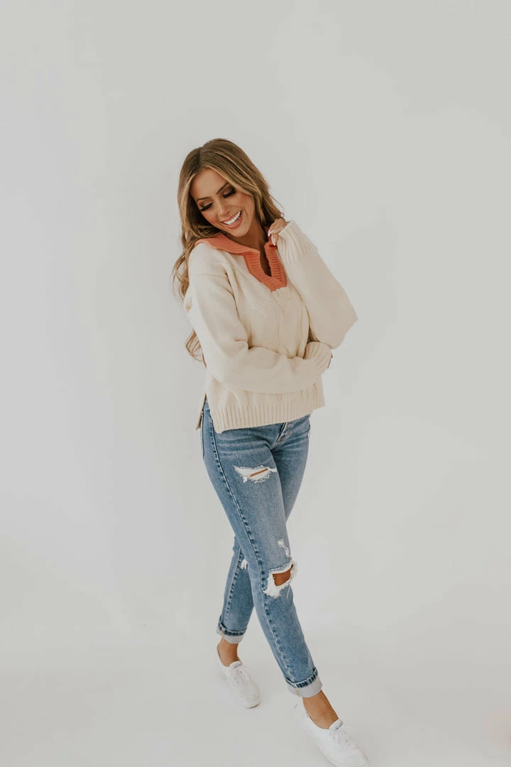 This sweater is the unique, one-of-a-kind piece you’ve been looking for! The coral color on the collar makes it a statement piece that pairs well with literally everything! Its the perfect sweater for a date night our or a trip to the pumpkin patch (;