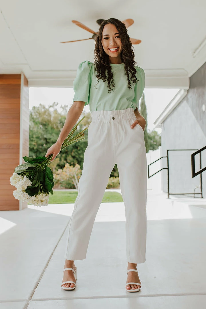 Paired with The Today is a Good Day Embroidered Tee in Coral, The Minnie Puff Sleeve Top in Mint and The Rachel Strappy Heels in Off White.
