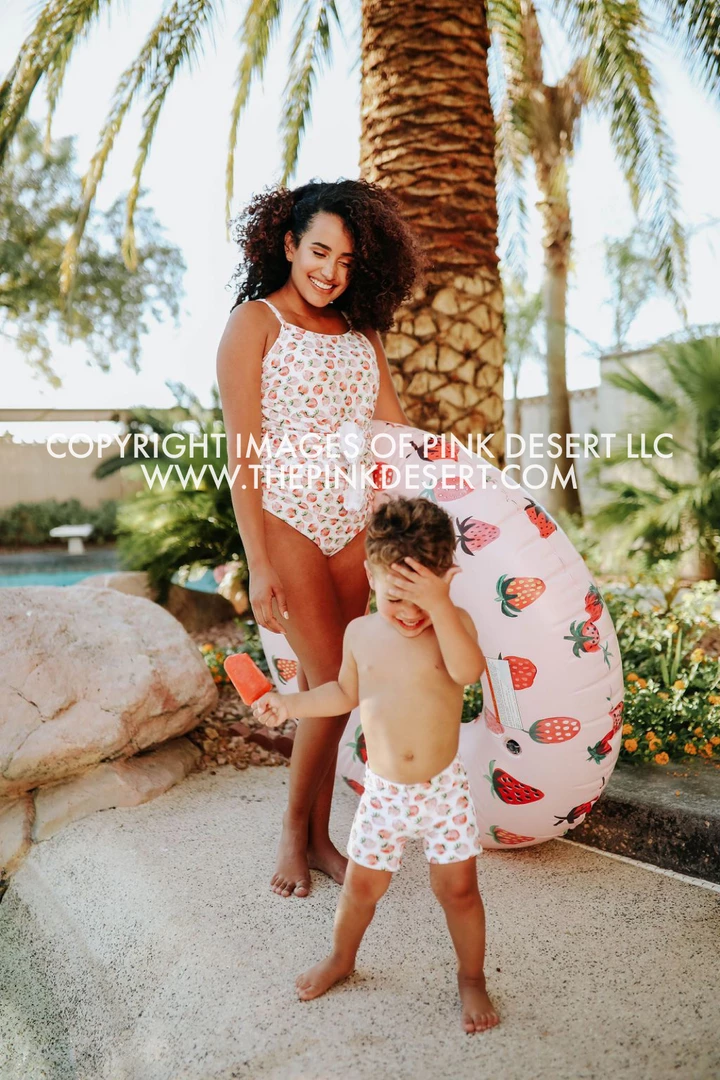 Introducing Pink Desert’s Mini European cut swim short for boys in Pink Desert’s custom summer strawberry print. Made especially in mind for our boy moms! Match your little man all summer long in these matching European cut swim shorts.