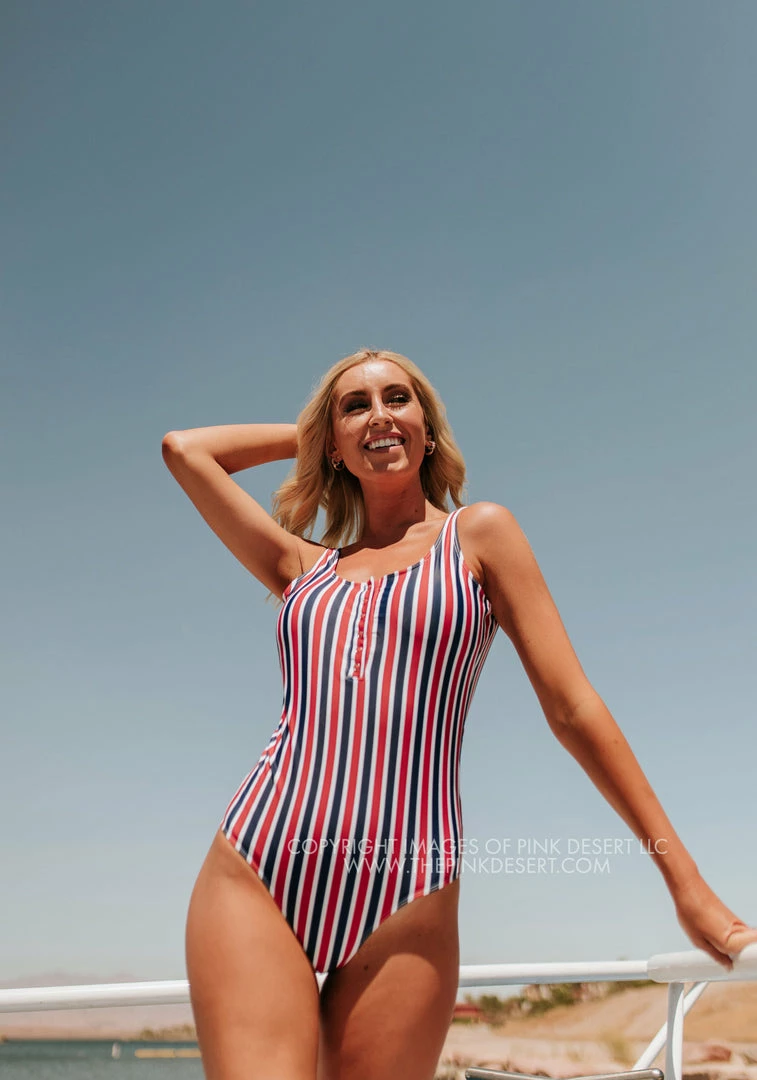 Surprise! We turned our best-selling Button Front Midkini into a one piece! This one piece has got it all. Full coverage, functional buttons, and a flattering shape! We are sure you’ll love this one piece as much as we do! Sewn in our custom Americana stripe print.