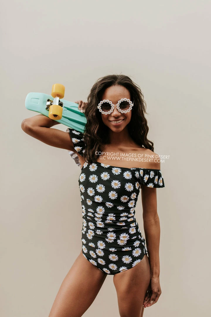 Pink Desert’s newest exclusive style for 2021, the Flutter Sleeve Ruched One Piece in our custom La La Daisy print. The swimsuit that flatters all shapes, sizes, and heights! Swimsuit features flattering side ruching and flutter sleeves that can be worn on or off the shoulder.