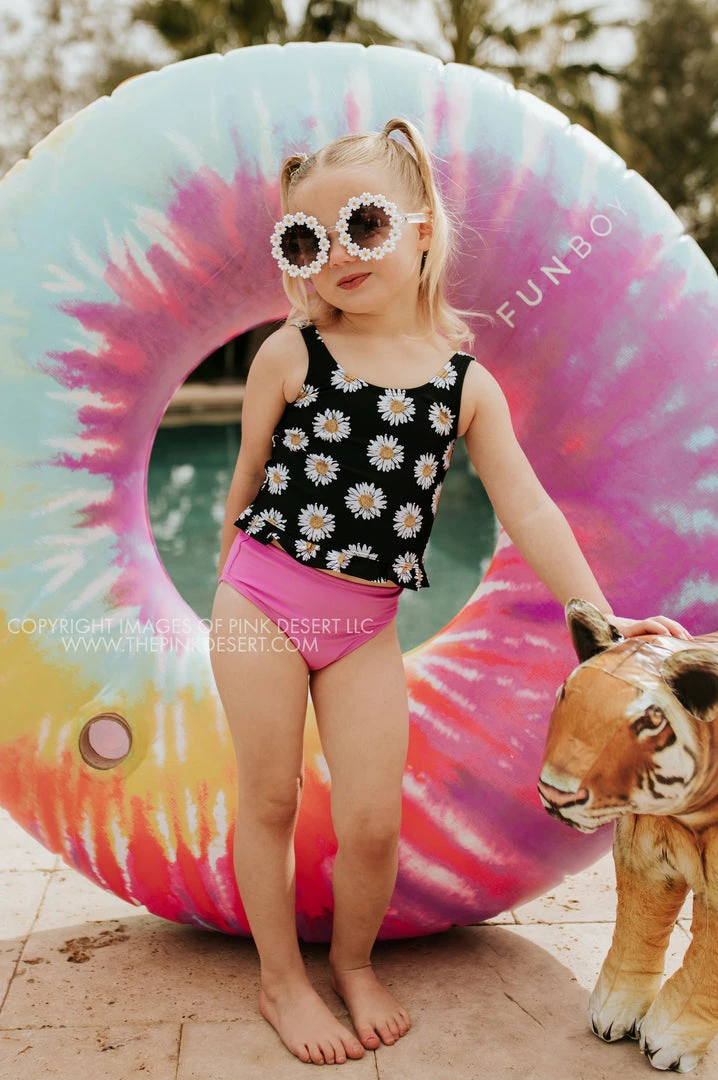 What’s better than swimming at the pool with your littles?! MATCHING swimsuits with your little girls at the pool! A Pink Desert exclusive Peplum tankini swim set for your little girl. This swim set features a ruffle peplum in our exclusive daisy print and a neon lilac high waist bottom.