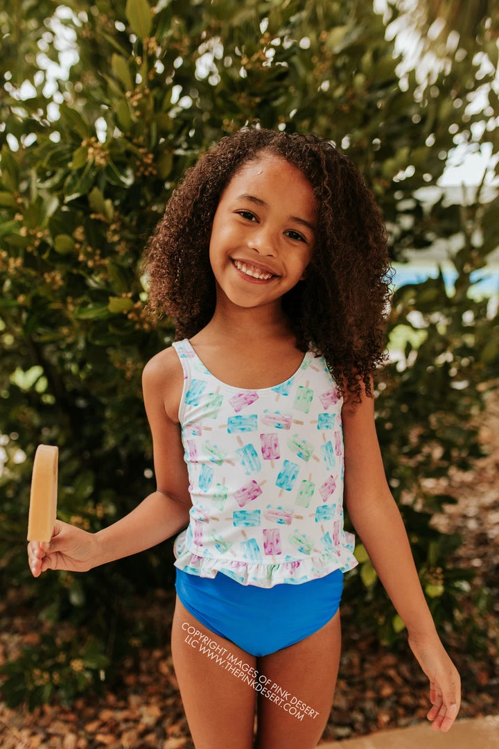 What’s better than swimming at the pool with your littles?! MATCHING swimsuits with your little girls at the pool! A Pink Desert exclusive Peplum tankini swim set for your little girl. This swim set features a ruffle peplum in our exclusive popsicle print and a royal blue high waist bottom.