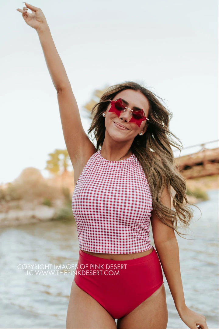 Paired with our Vintage High Waist Swim Bottoms Cherry Red.