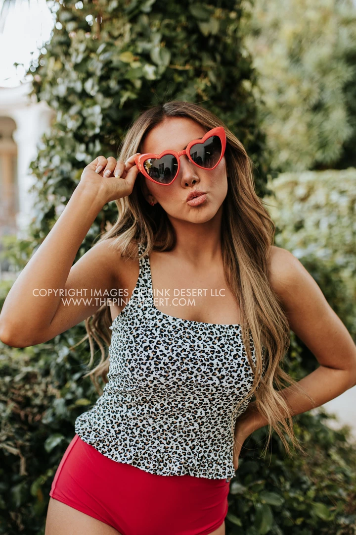 Flirty and fun, meet our newest updated peplum style swimsuit in our custom snow leopard print. Swimsuit features a flattering square neckline and supportive 1″ shoulder straps. Mini ruffle peplum hits at the smallest part of the waist. Mix and match with our Pink Desert high waist swim bottoms to create your own look of swimwear!