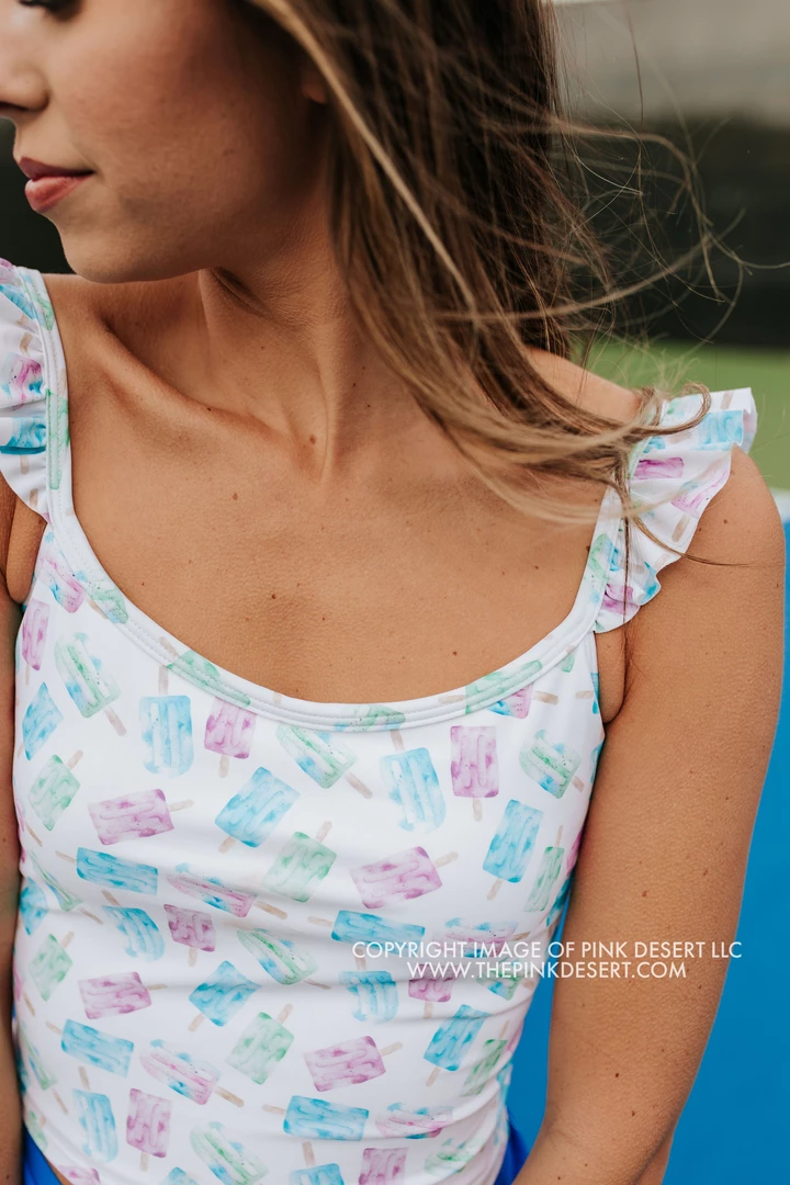 The newest midkini to the Pink Desert Exclusive Swim Line, the Sweety Flutter Crop. The flutter detail on the straps give a fun, feminine, and playful touch. This top gives you the modest, full coverage you need while still looking trendy poolside!