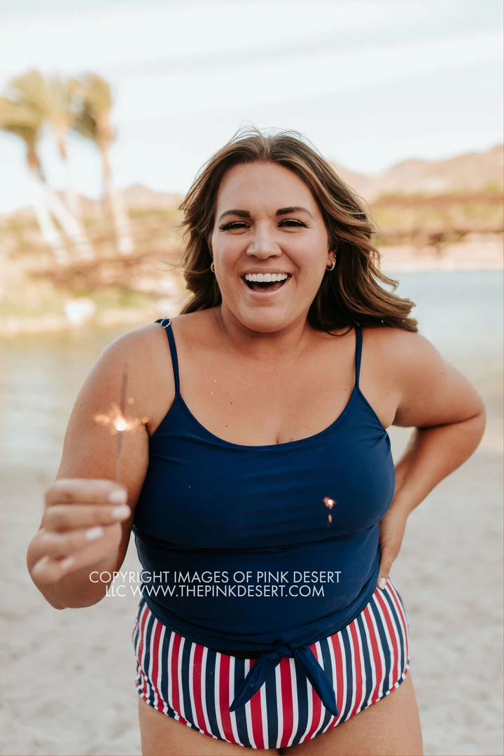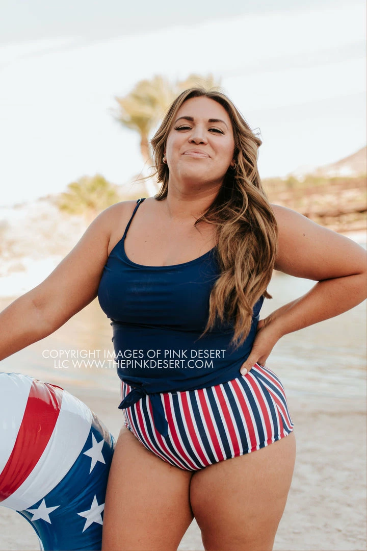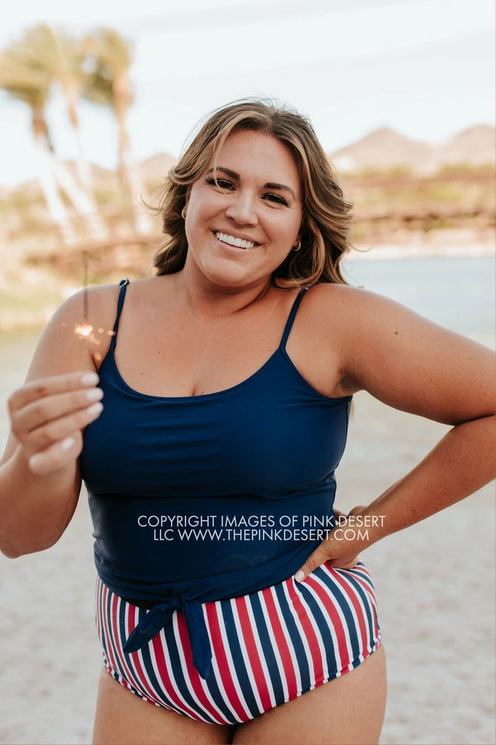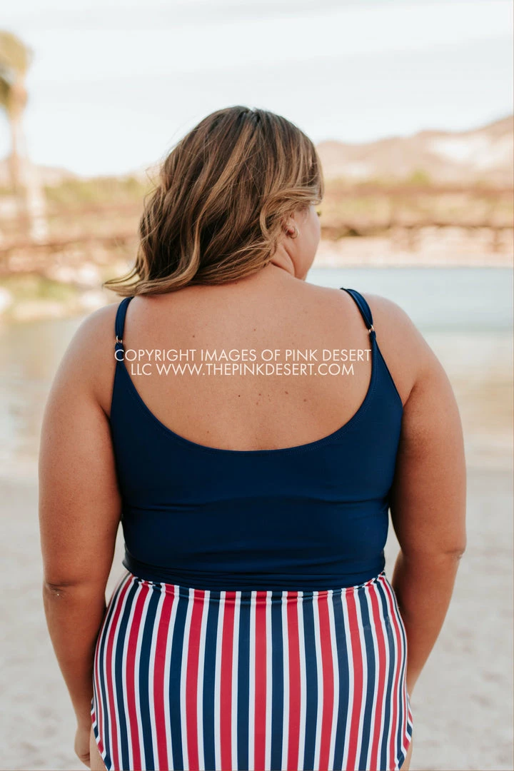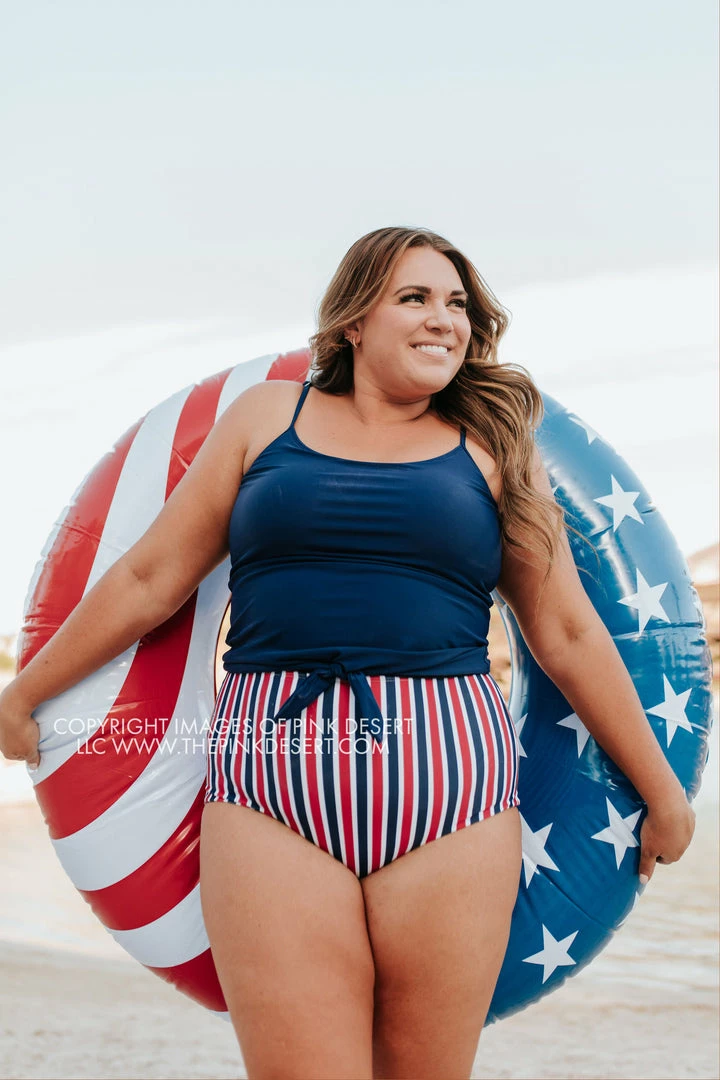Paired with our High Waist Swim Bottoms in Spangled Star, Vintage High Waist Swim Bottoms in Americana Stripe.