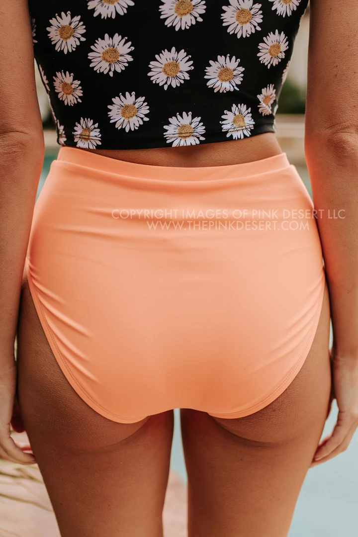Our new vintage high waist swim bottom with a higher cut leg in Neon Orange. Perfect for the ladies who want a moderate cut leg opening that elongates the leg. Slimming waistband at the top.