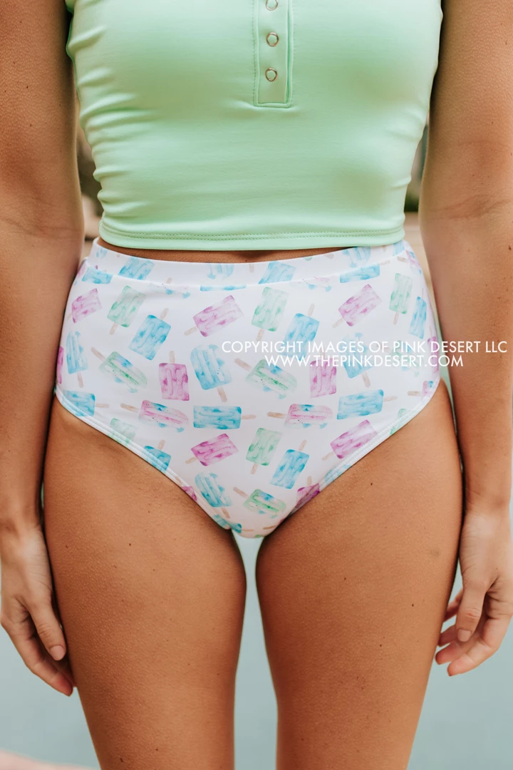 Our vintage high waist swim bottom with a higher cut leg. Perfect for the ladies who want a moderate cut leg opening that elongates the leg. Slimming waistband at the top.