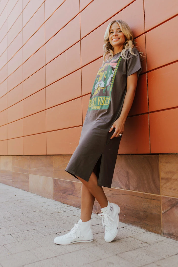 A fun twist to your basic t-shirt dress, the Desert Vibes Dress is so cute! The relaxed fit is so comfy and perfect for those warm summer days! It’s also a perfect transition piece for fall and can be paired with your favorite jean jacket and booties!