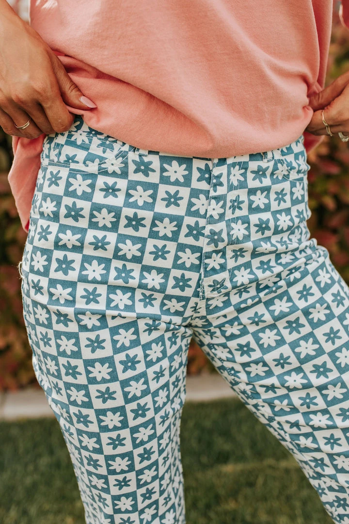 Spring has arrived, and the Flower Box Bottoms are perfect to greet it! Blue and white checkers with contrasting floral, she is the funnest pants you ever did see! Pair it with sneakers and a tee and you are ready for the day!