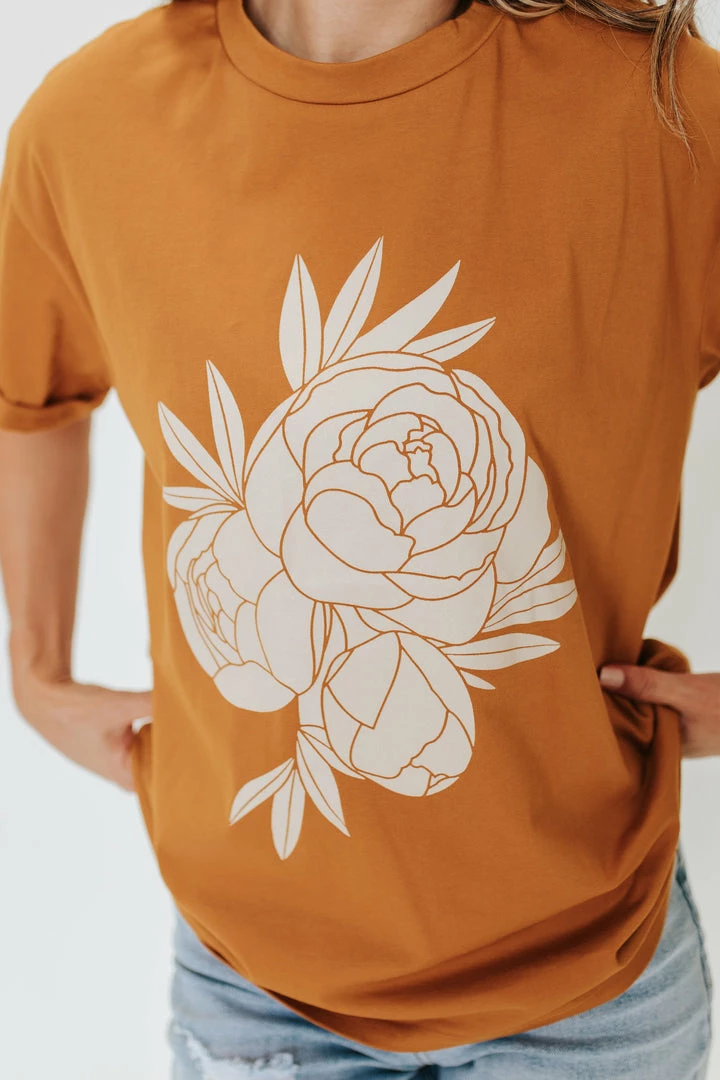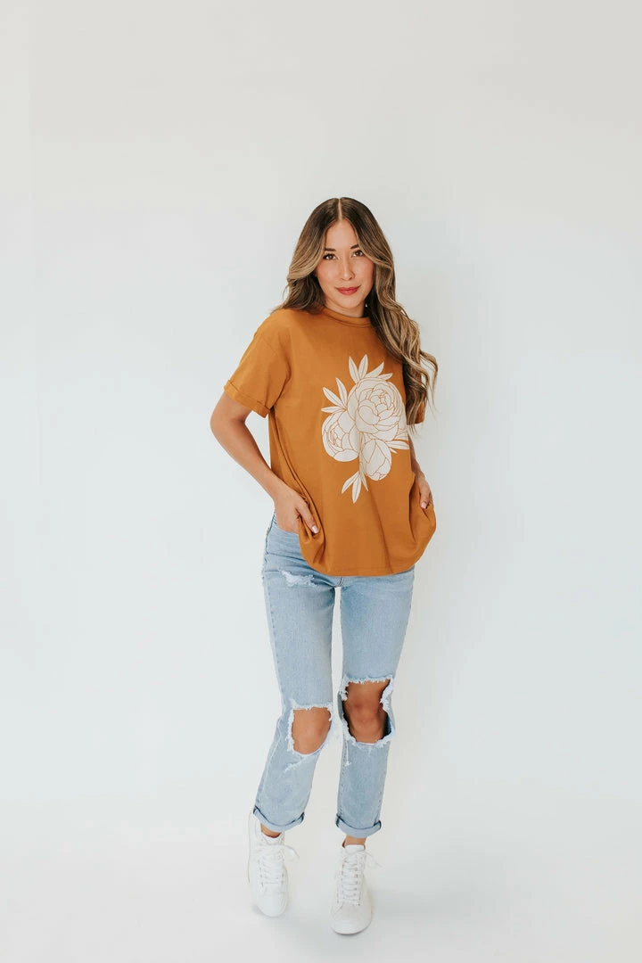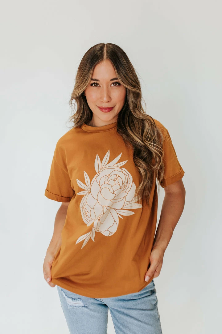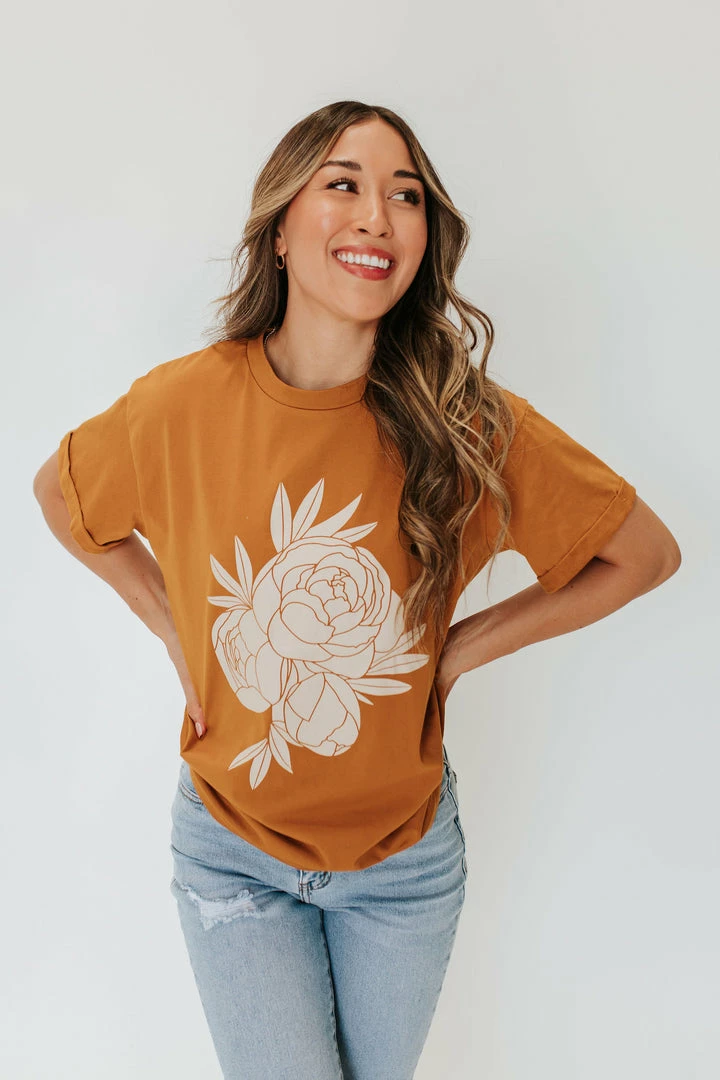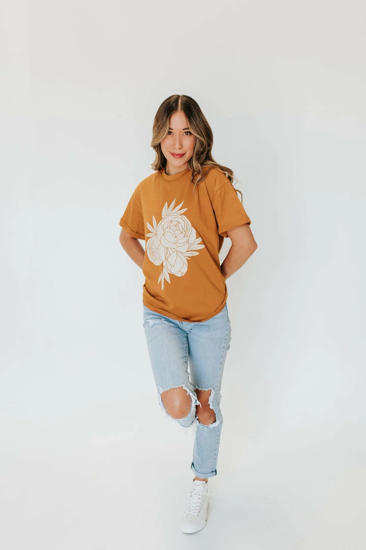 The Peony tee is the perfect summer graphic tee! The color is to die for and the cute graphic is so simple and unique! We love the cuffed sleeves and relaxed fit. Pair this with literally anything for a cute summer outfit!