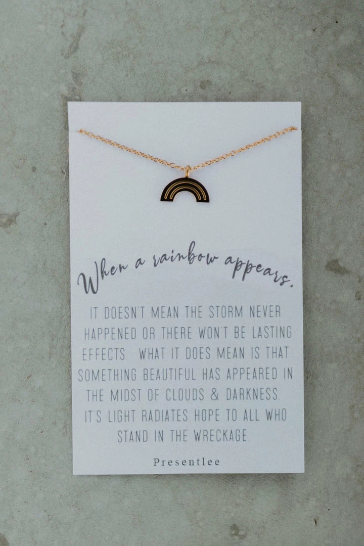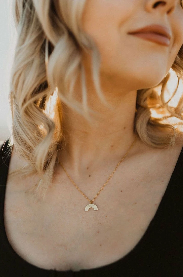 - Dainty rainbow necklace on 9″ adjustable gold chain