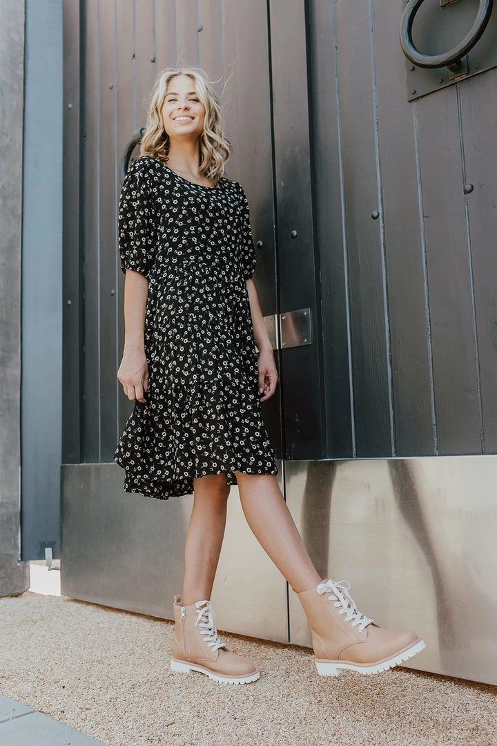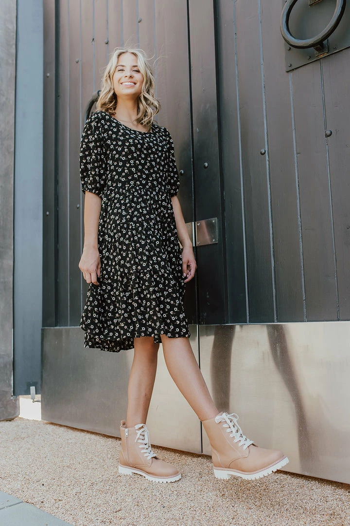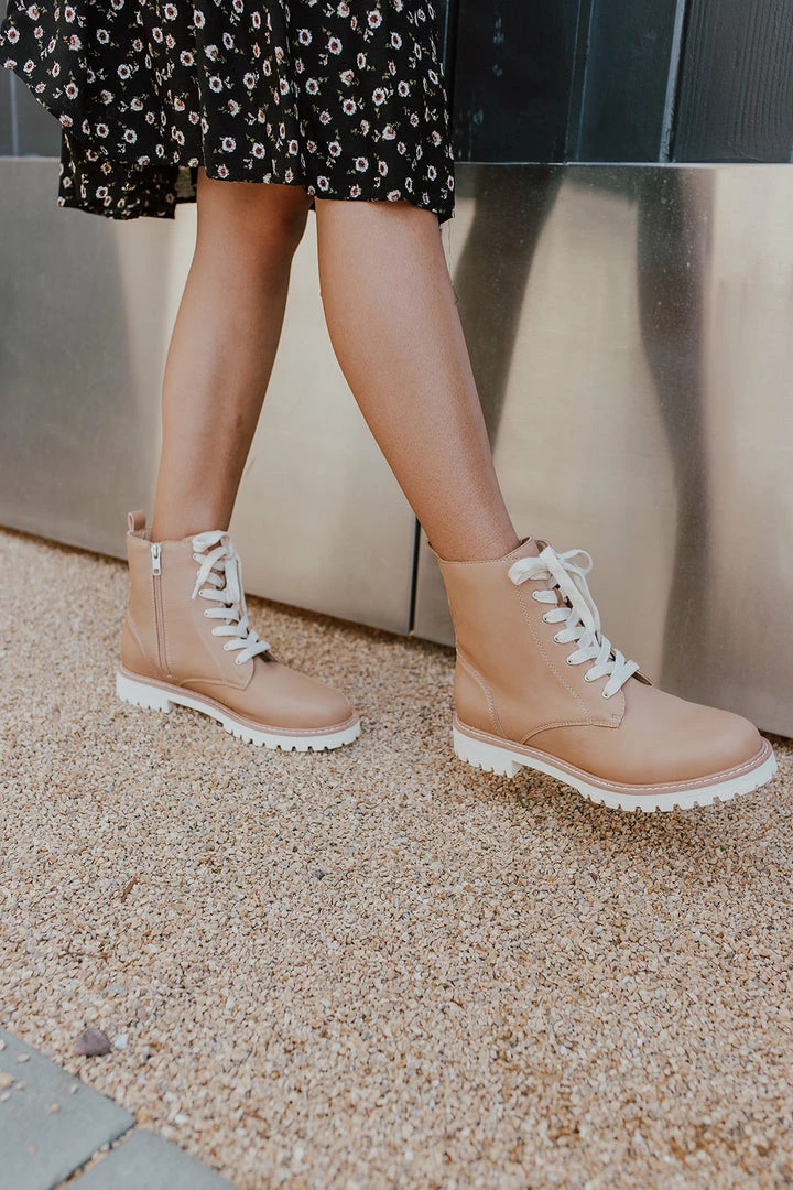 When this boot arrived, our entire team said they have not seen a cuter and edgier shoe! We are loving Combat Boots this season! Paired perfectly with a skirt, graphic tee and everything in between! This shoe is perfect to dress up or go casual.