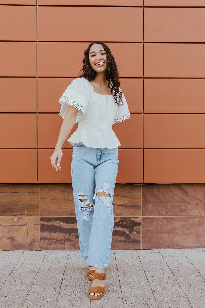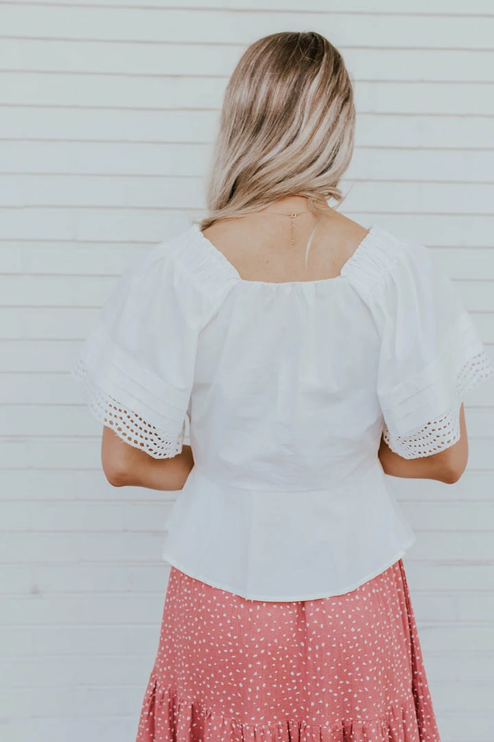 Catch the eye of that special someone in this gorgeous top! An elevated staple, every closet needs this crisp white blouse!