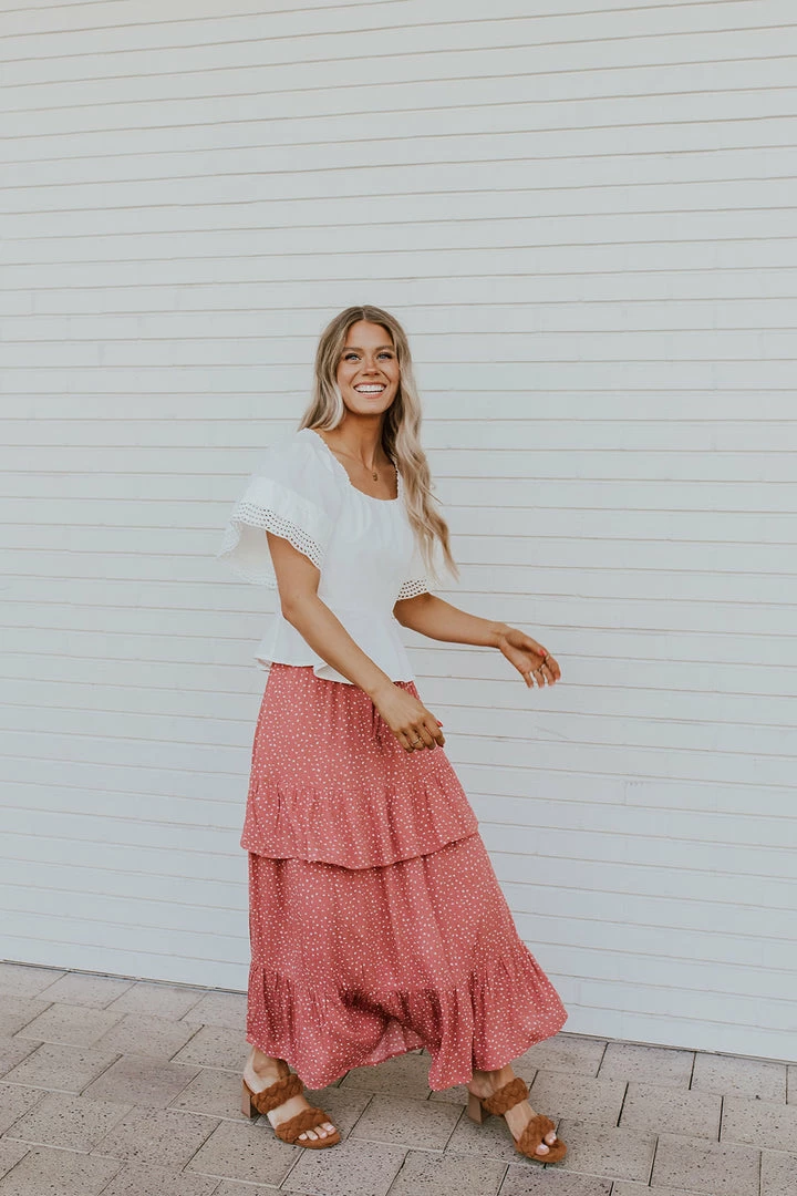 Paired with The Maria Tiered Skirt in Marsala, The Jaime High Rise Dad Jeans in Light Wash, The Heaven Braided Heels in Camel