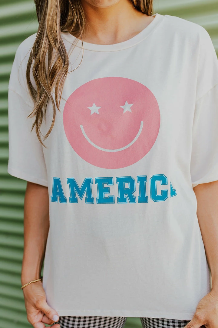 Smile in this adorable America tee! This patriotic graphic tee is perfect for all year round wear! You can pair this with biker shorts, jeans, leggings, or even over dresses for a cute and happy outfit!