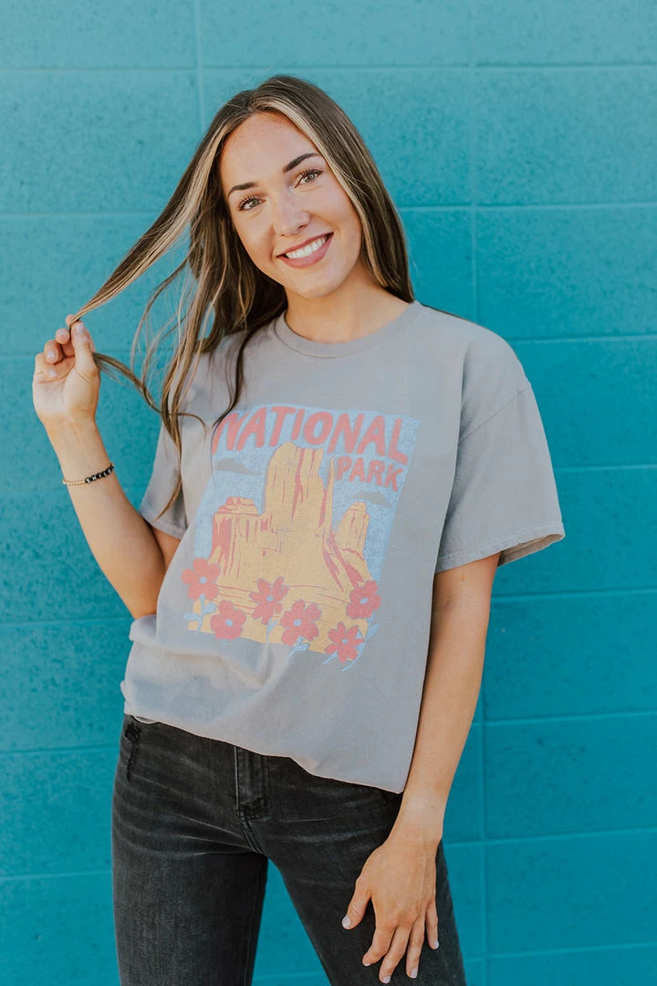 This adorable tee is a fun addition to the graphic tee collection! The cute national park graphic makes it perfect to wear on all of your outdoor outings this summer! Pair over biker shorts for a great hiking outfit!