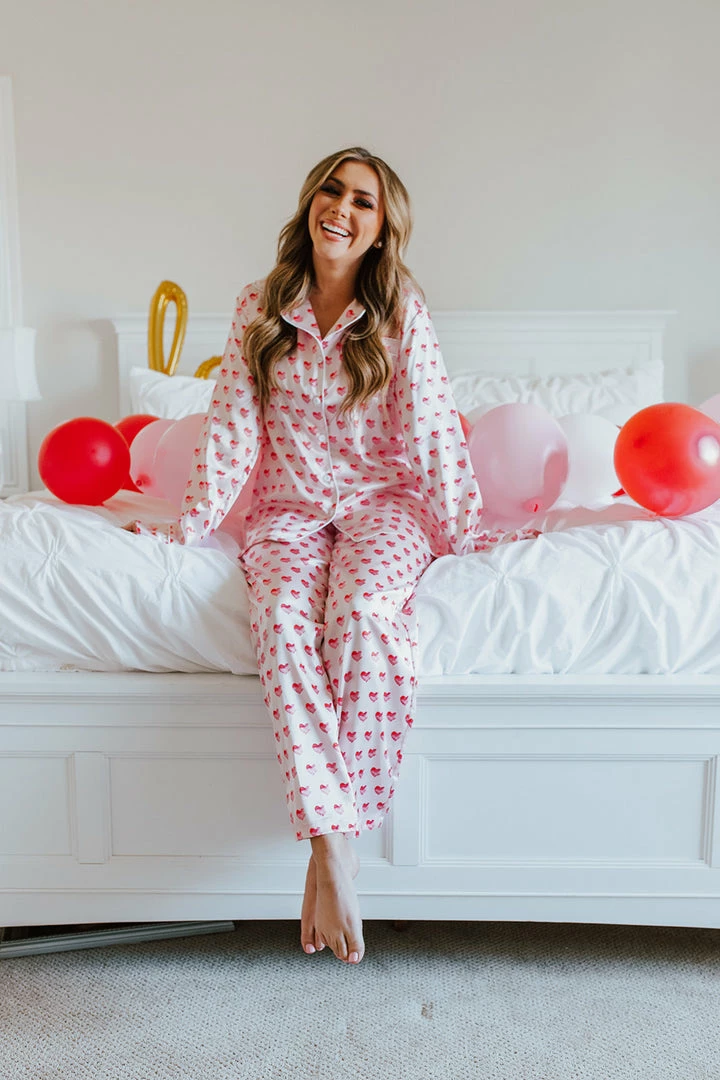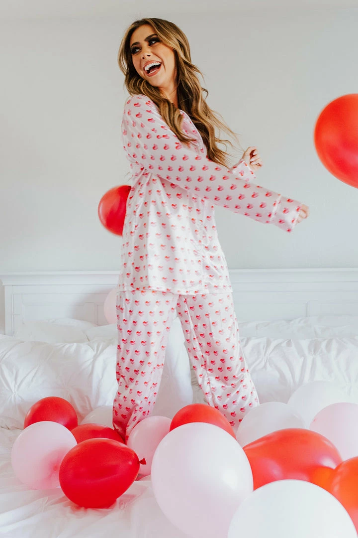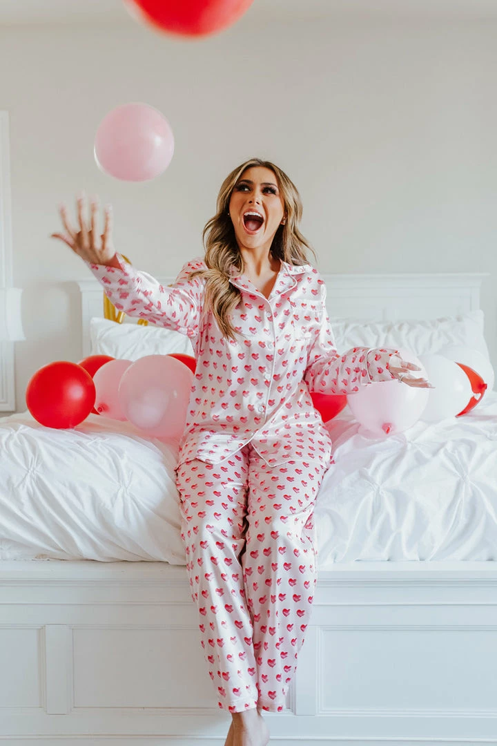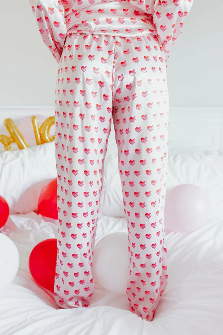 Cozy up all year long in these exclusive heart jammies! The silky satin will keep you cool, while still offering plenty of warmth! The perfect gift for any lady in your life!