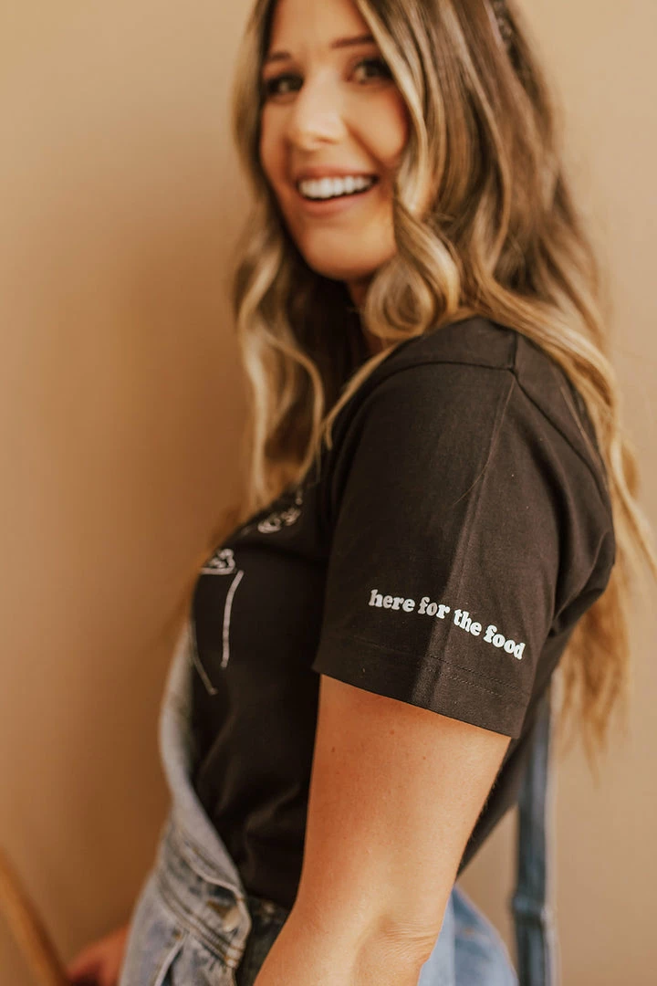 - “here for the food” on left sleeve
