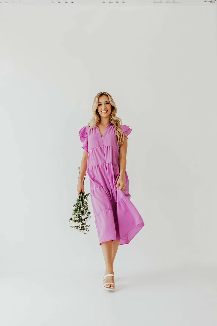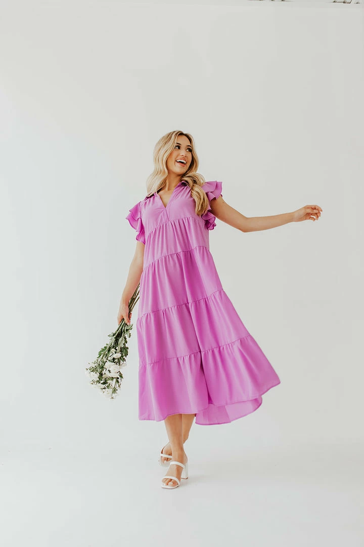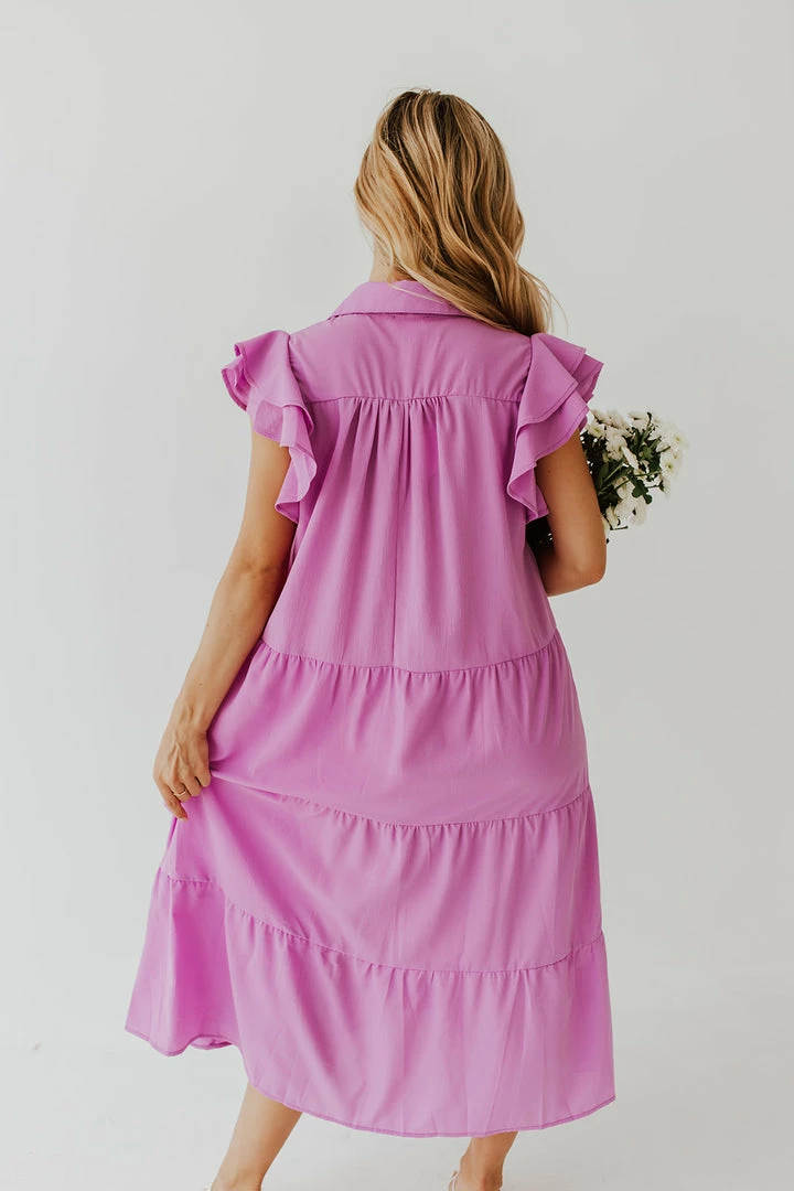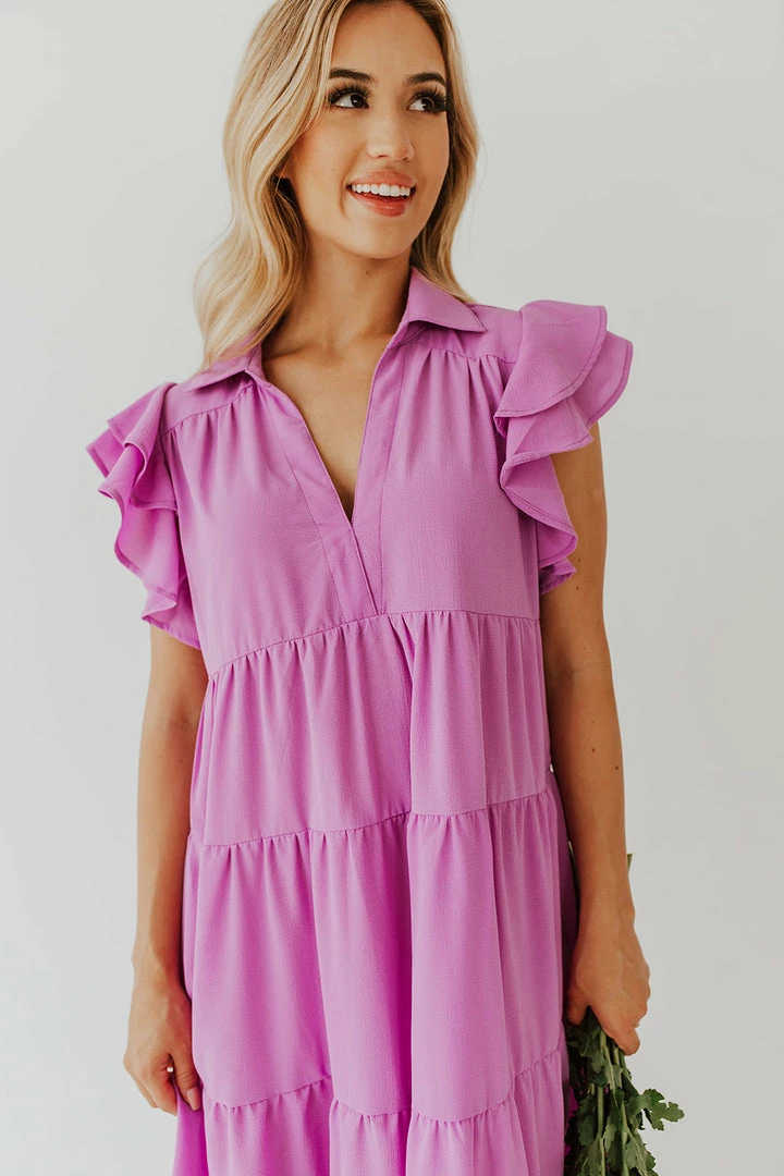 The color alone makes this dress a must have. The feminine details of ruffled sleeves, collar, and tiering make this the perfect summer dress for any special event you have going on. Dress this up with heels or down with sandals.