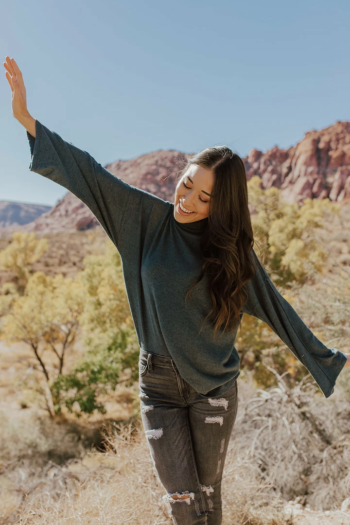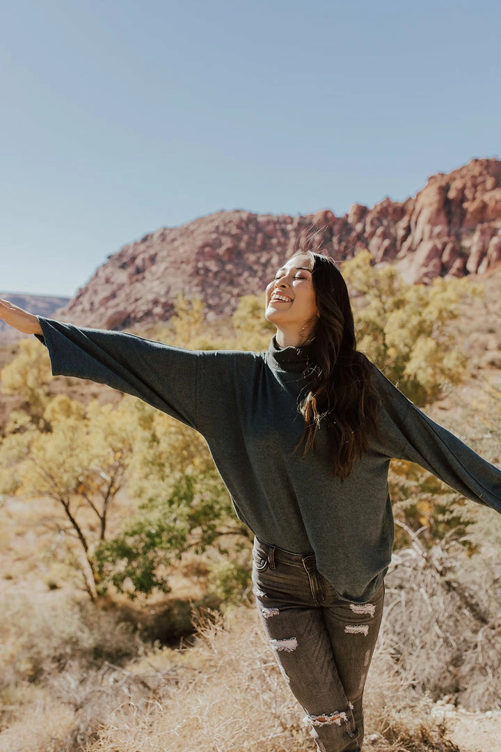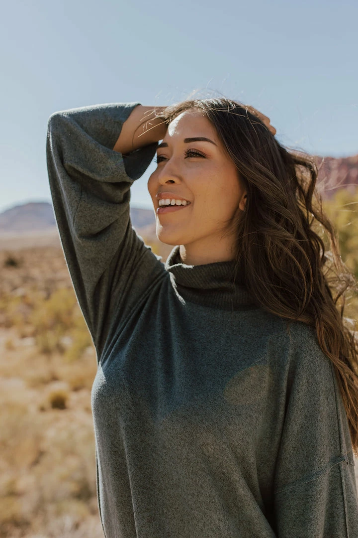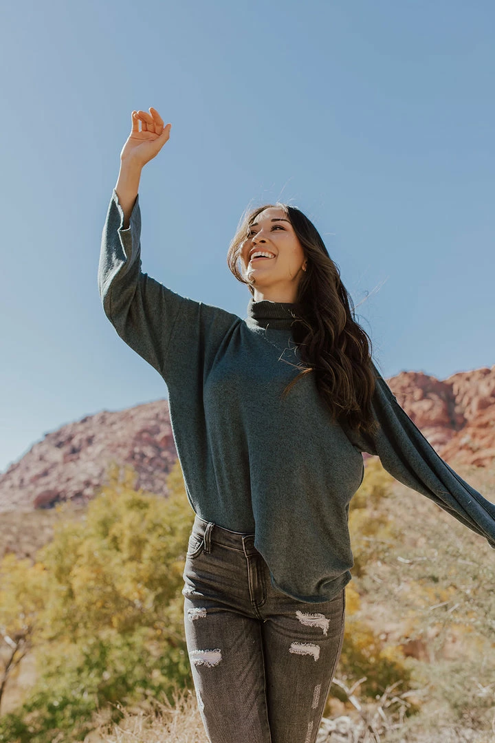 The Auden Turtleneck is the PERFECT top! It comes in a gorgeous evergreen color, perfect for fall. It is a loose fitting with a soft feel. This top looks pretty with skirts and jeans, dressed up or down!