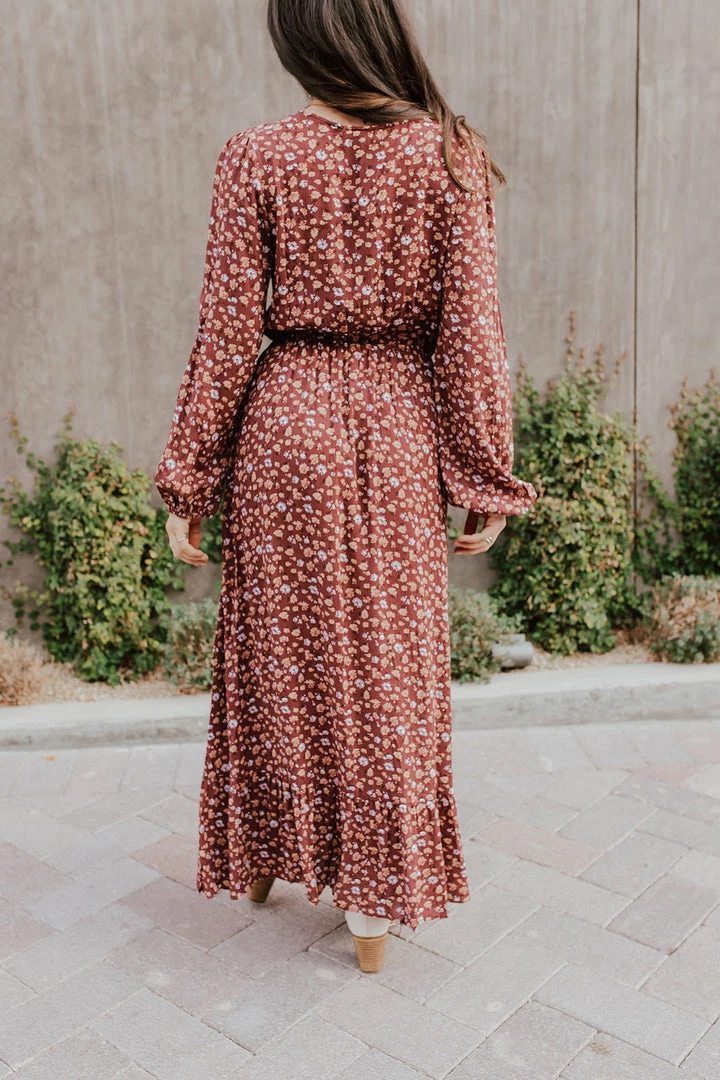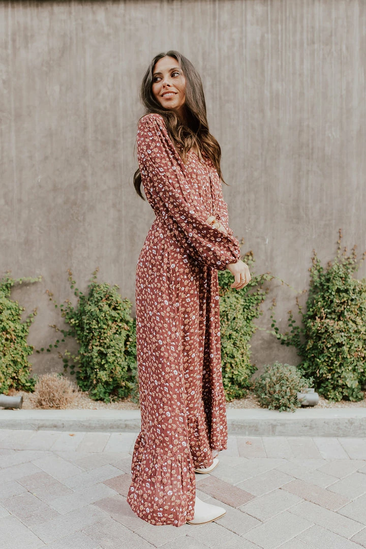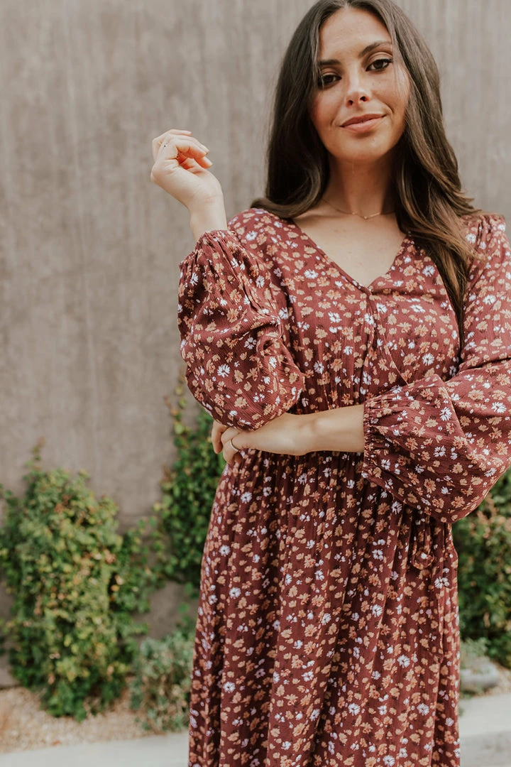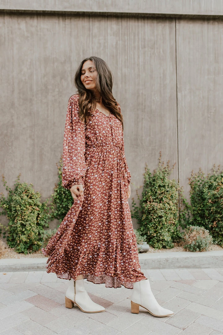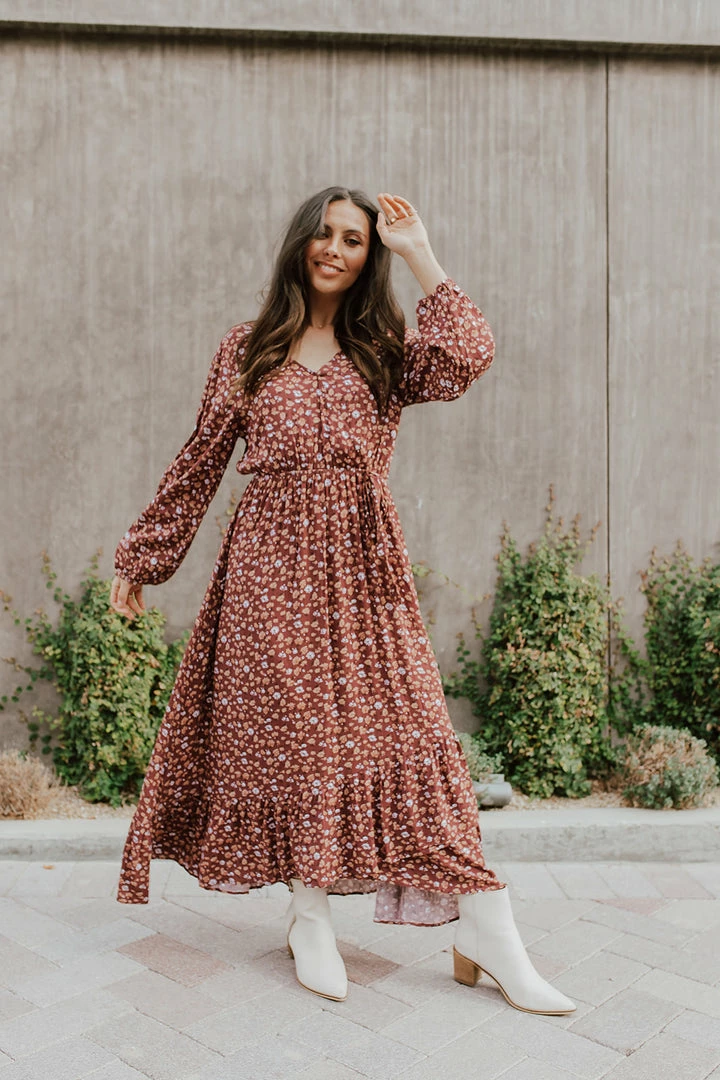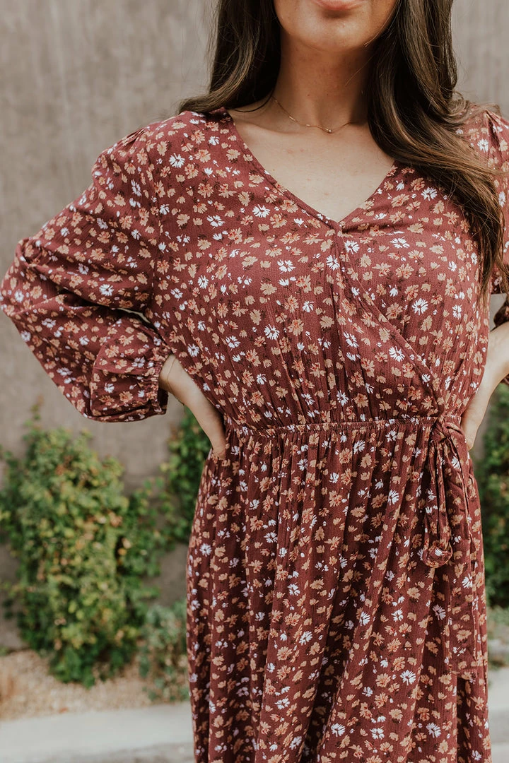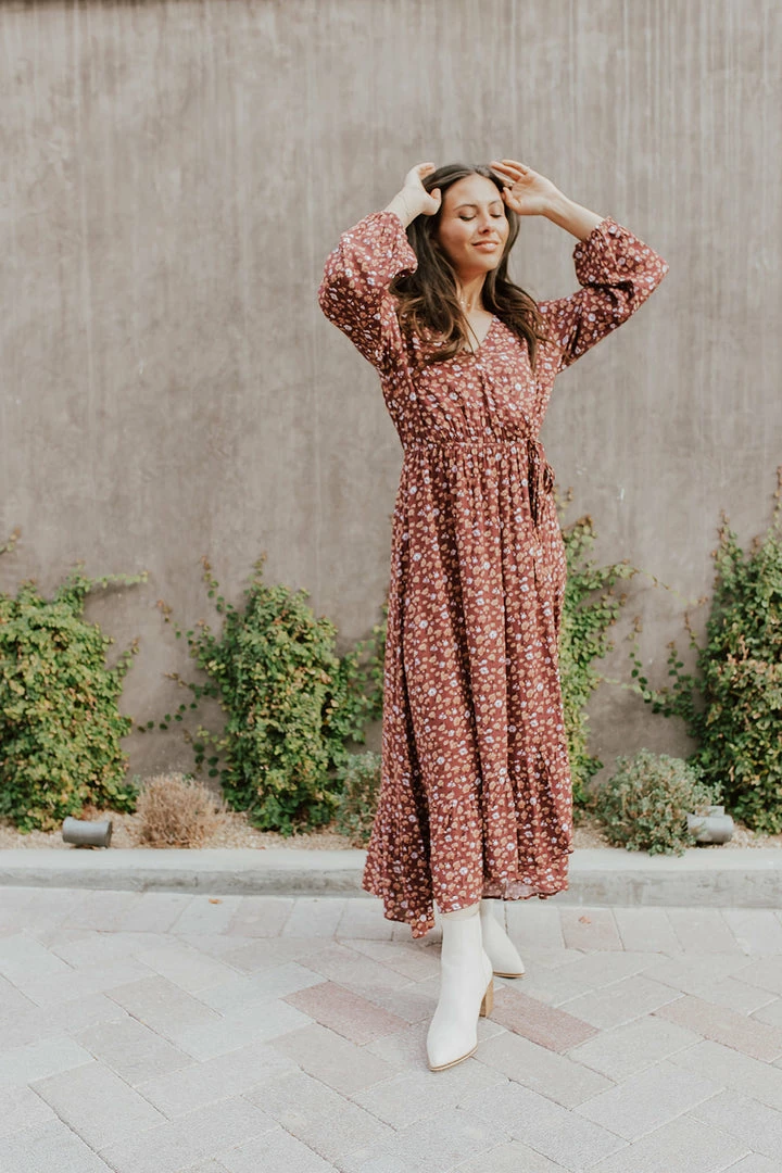 Floral dresses for days! We love the dainty floral print on the gorgeous burgundy red! Perfect for the holiday season! It’s flowy and has an adjustable waist tie making it flattering for all!