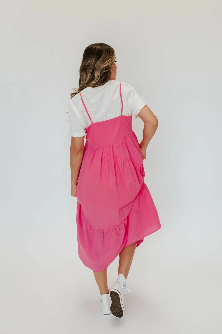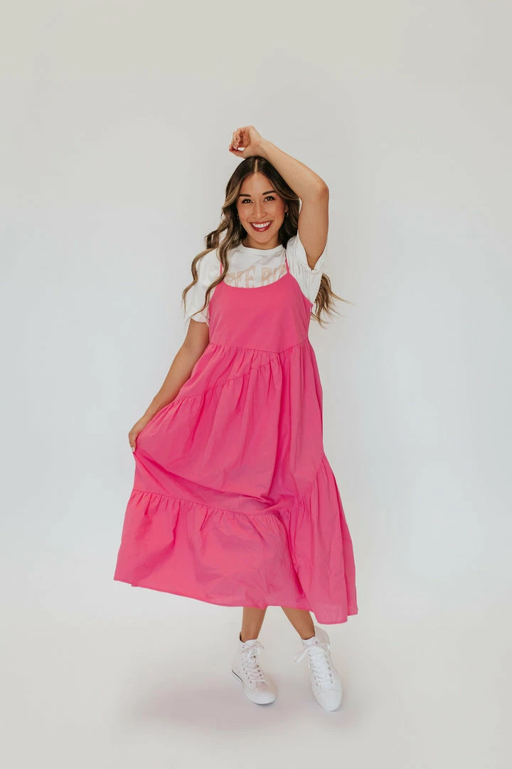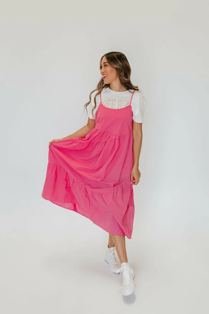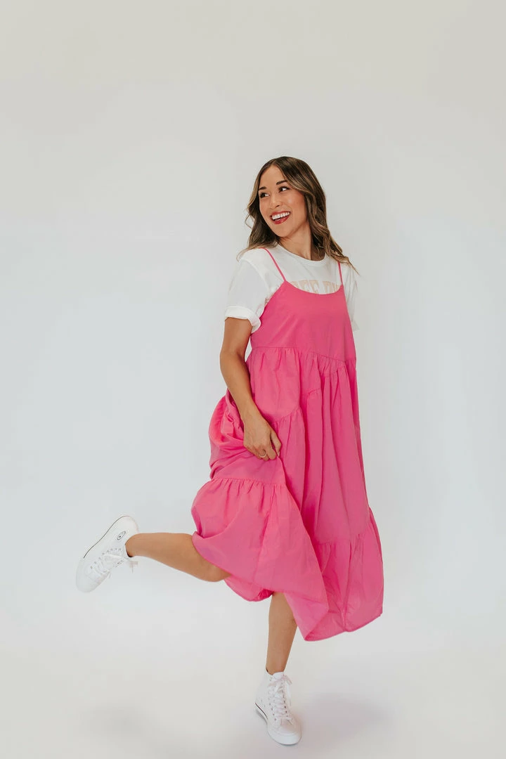 The Hallie Tiered Dress will be your go to this summer! Throw this lightweight spaghetti strap on with any tee underneath, a graphic tee or denim jacket over the top, and you have the perfect easy summer outfit!